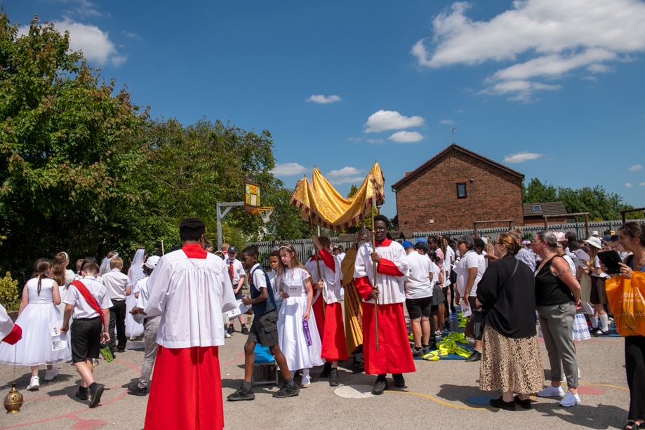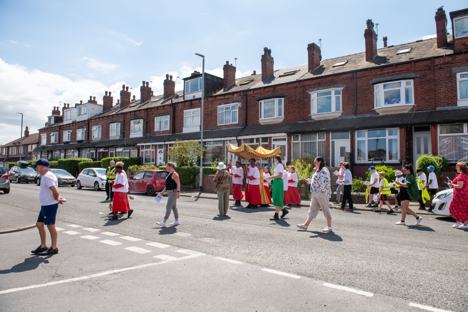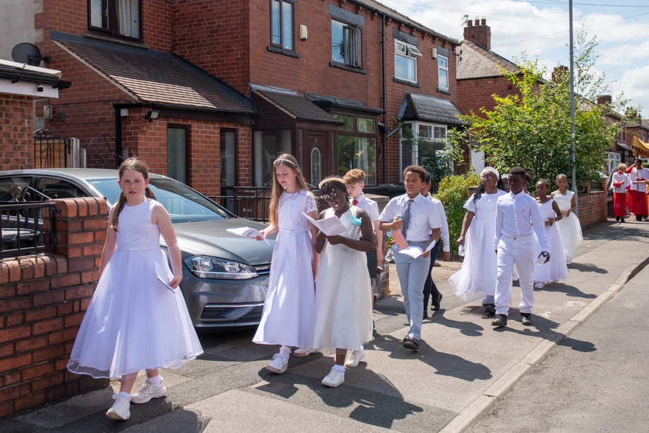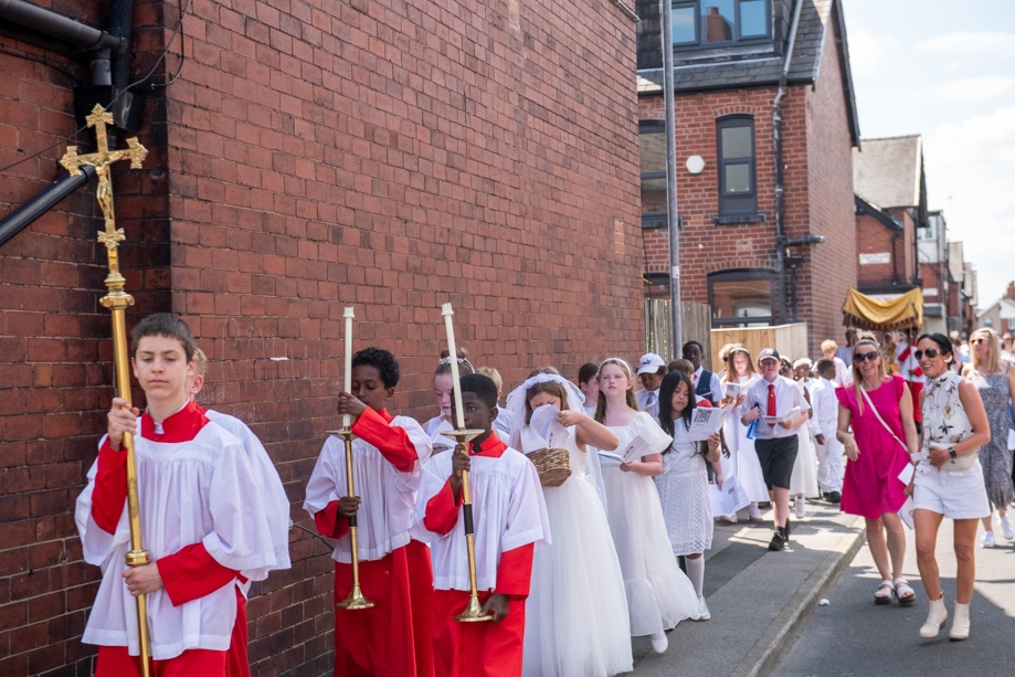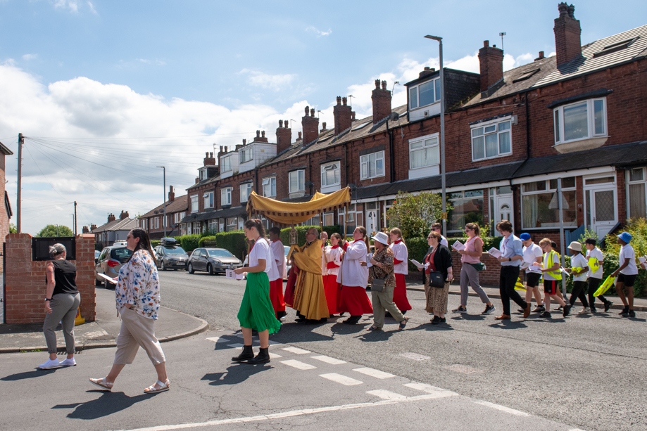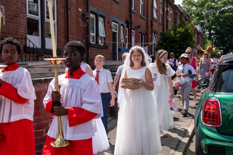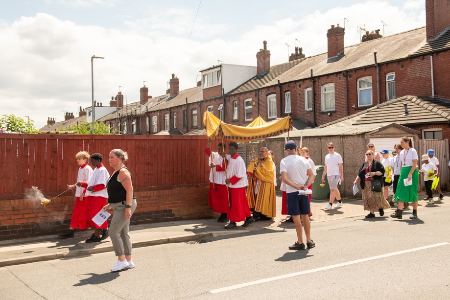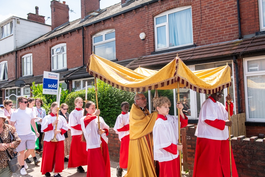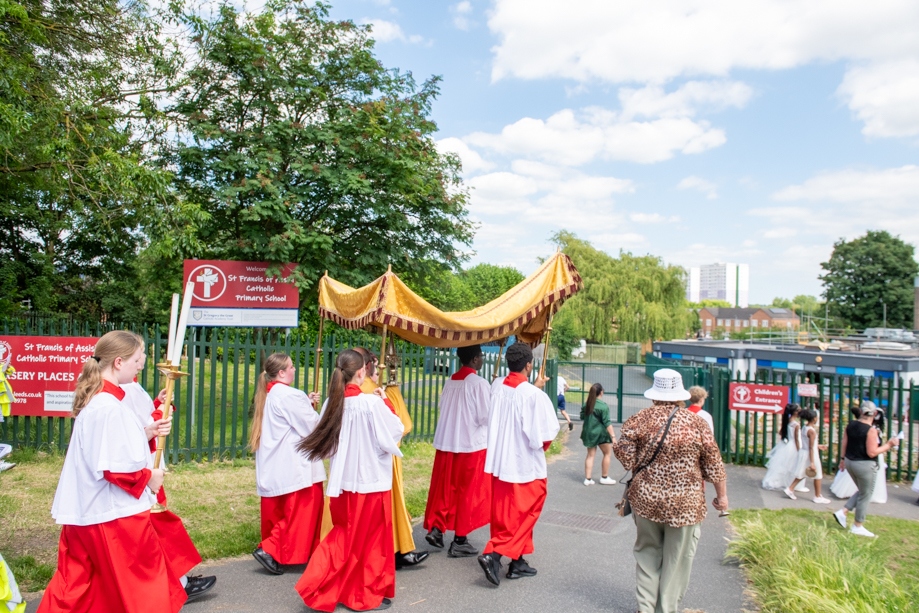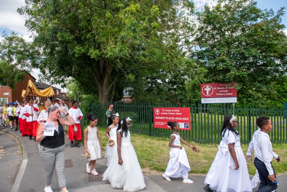 On Monday 24 June 2024, the Corpus Christi Procession took place through the streets of Beeston between St Anthony’s Catholic Primary School, Beeston and St Francis Of Assisi Catholic Primary School in St Maximilian Kolbe Parish, Leeds.