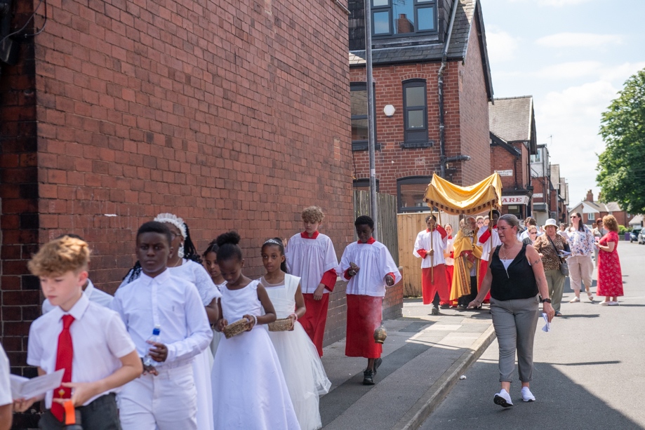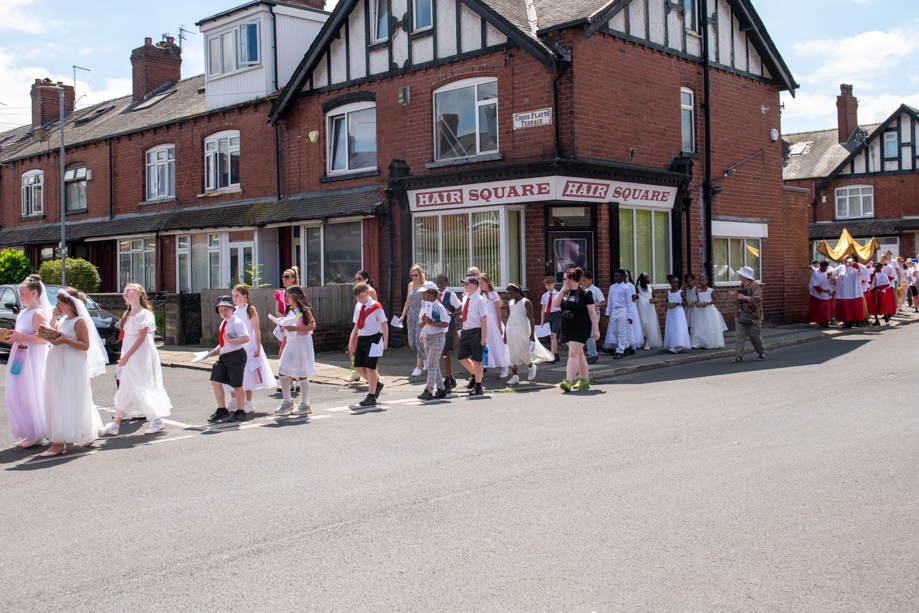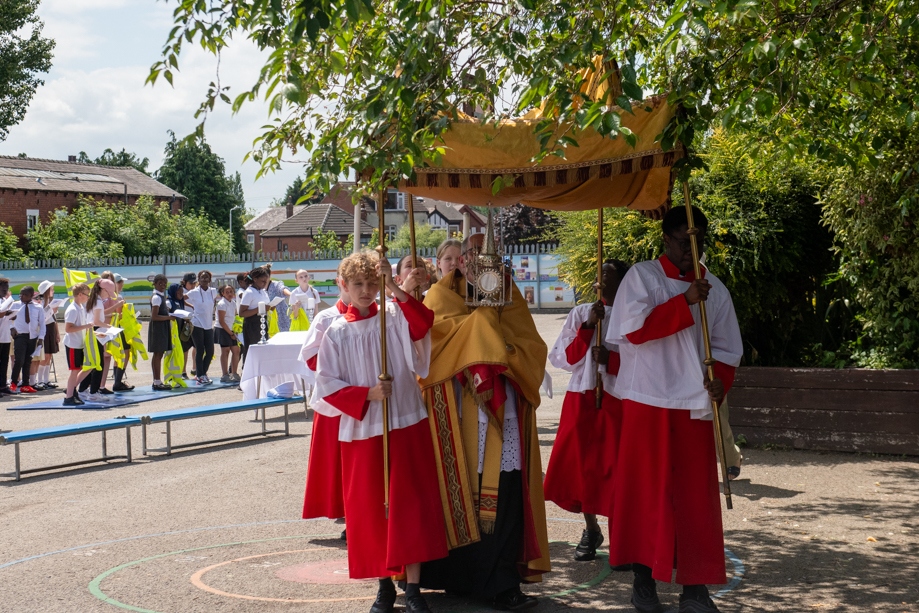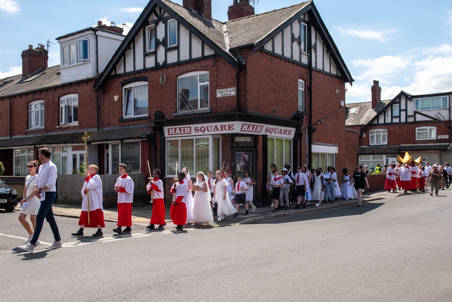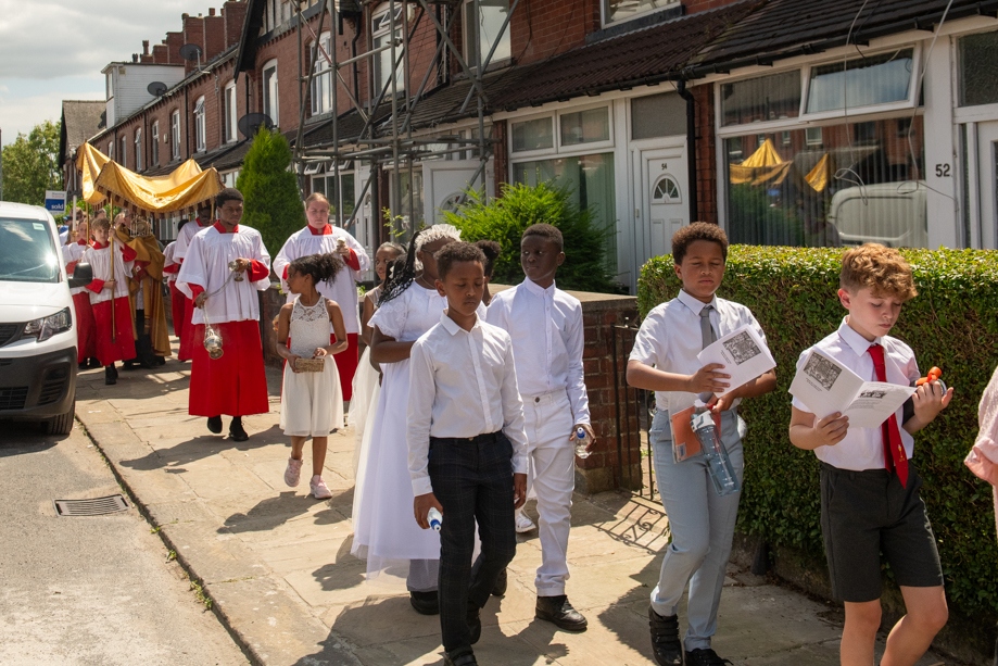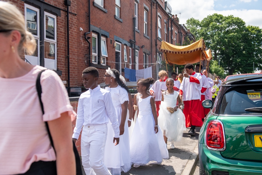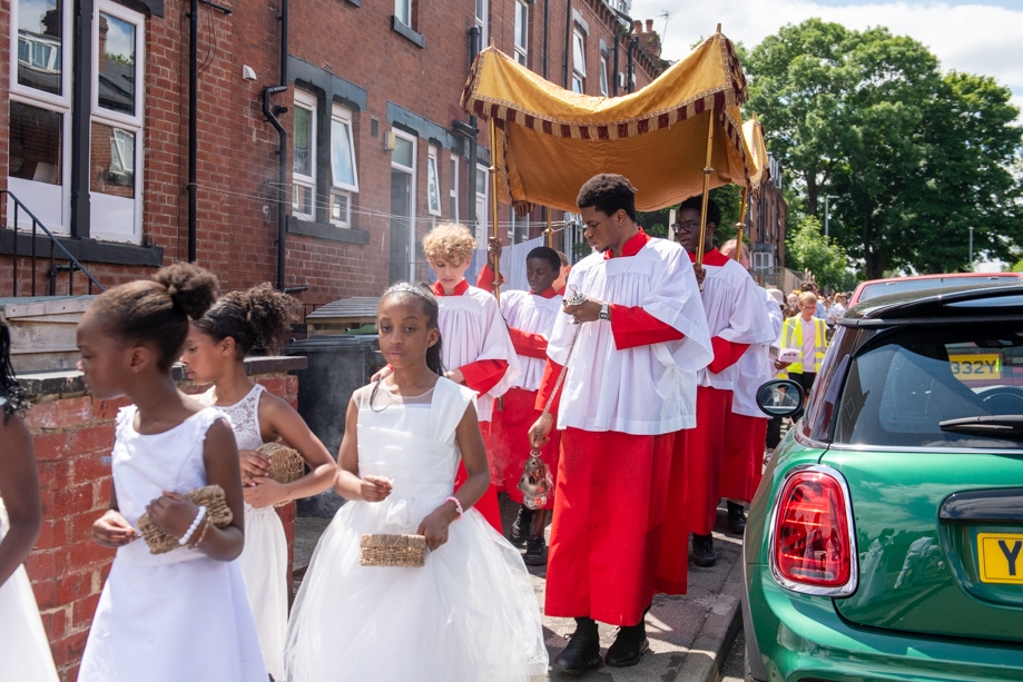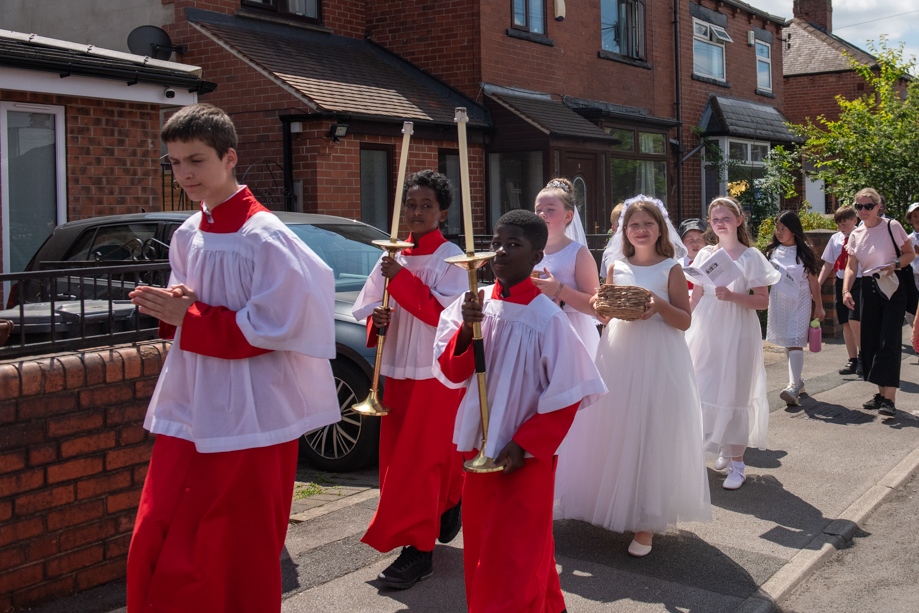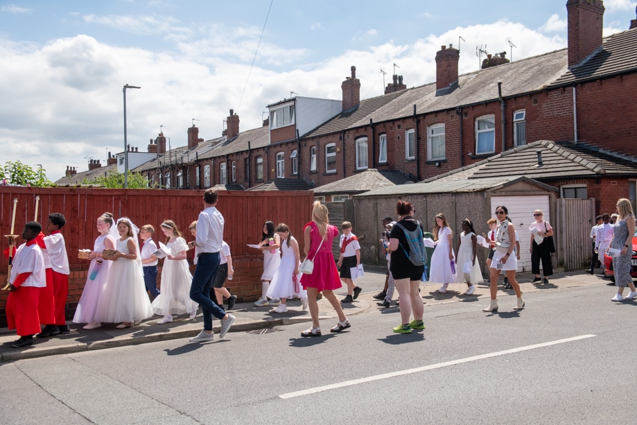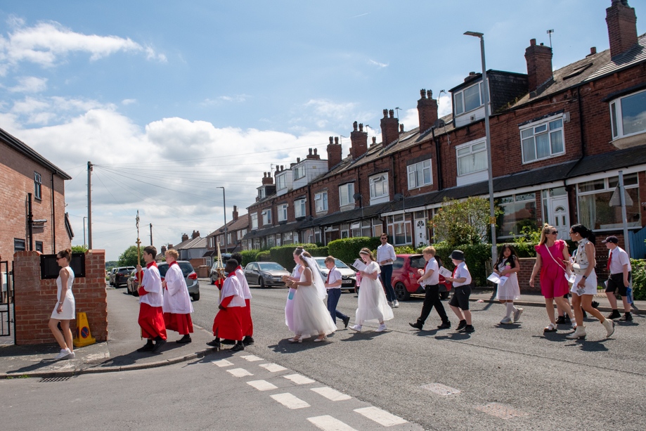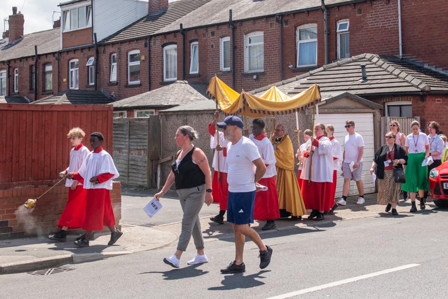 On Monday 24 June 2024, the Corpus Christi Procession took place through the streets of Beeston between St Anthony’s Catholic Primary School, Beeston and St Francis Of Assisi Catholic Primary School in St Maximilian Kolbe Parish, Leeds.