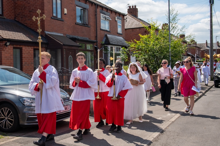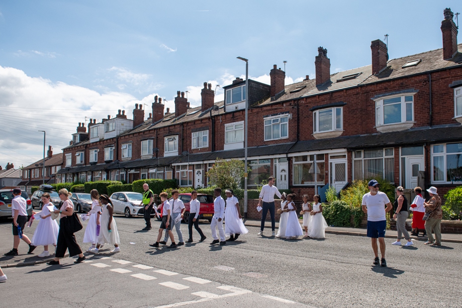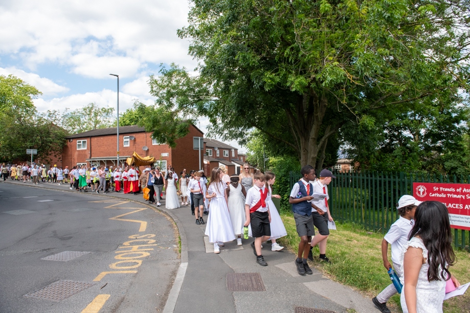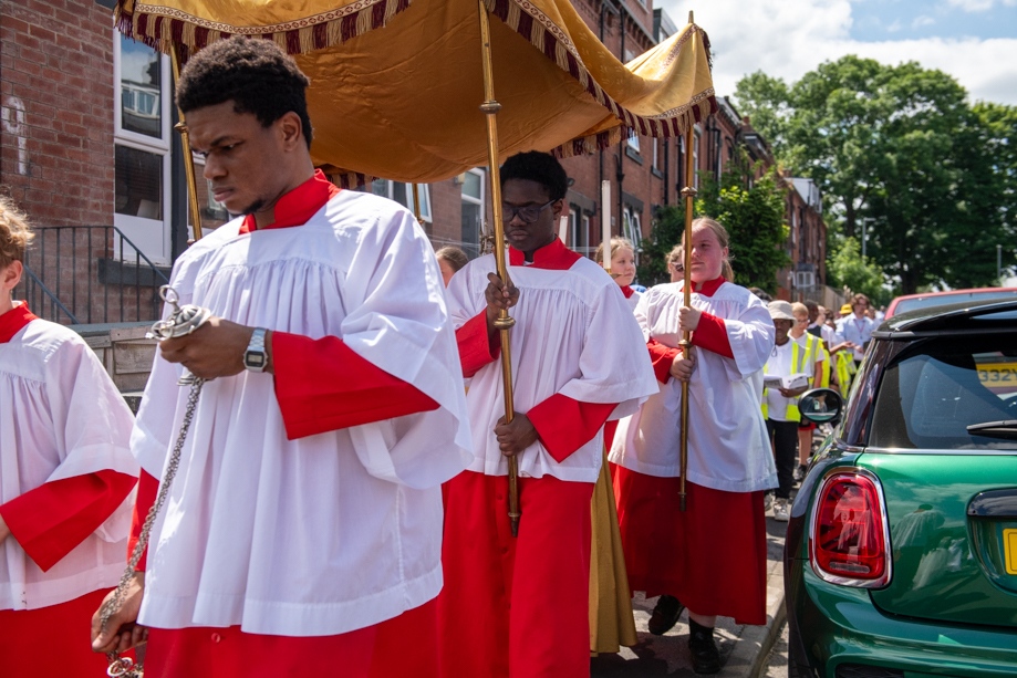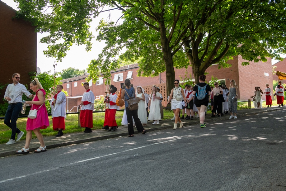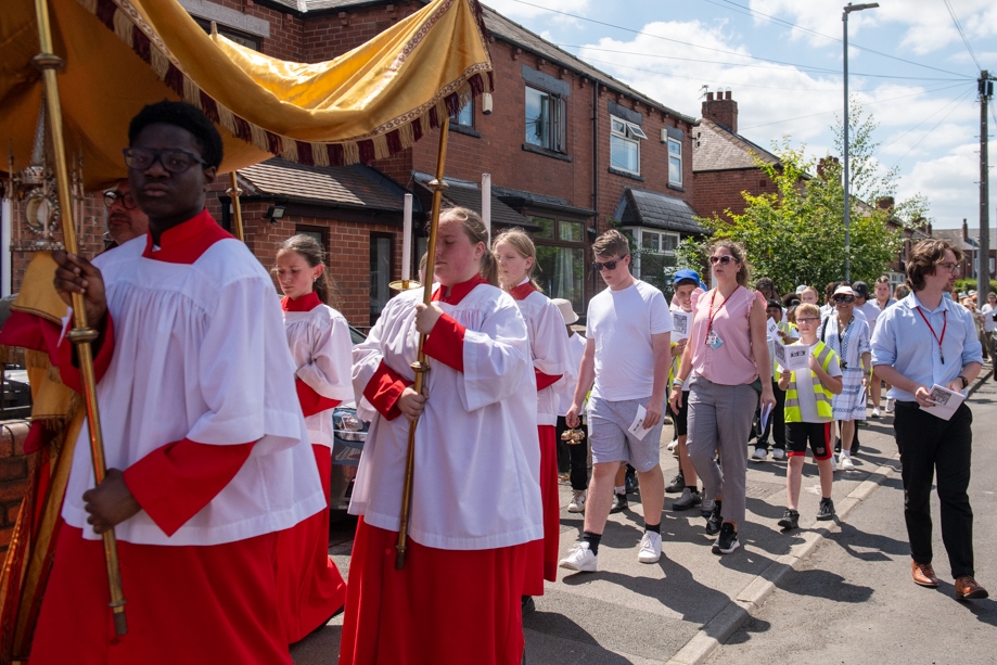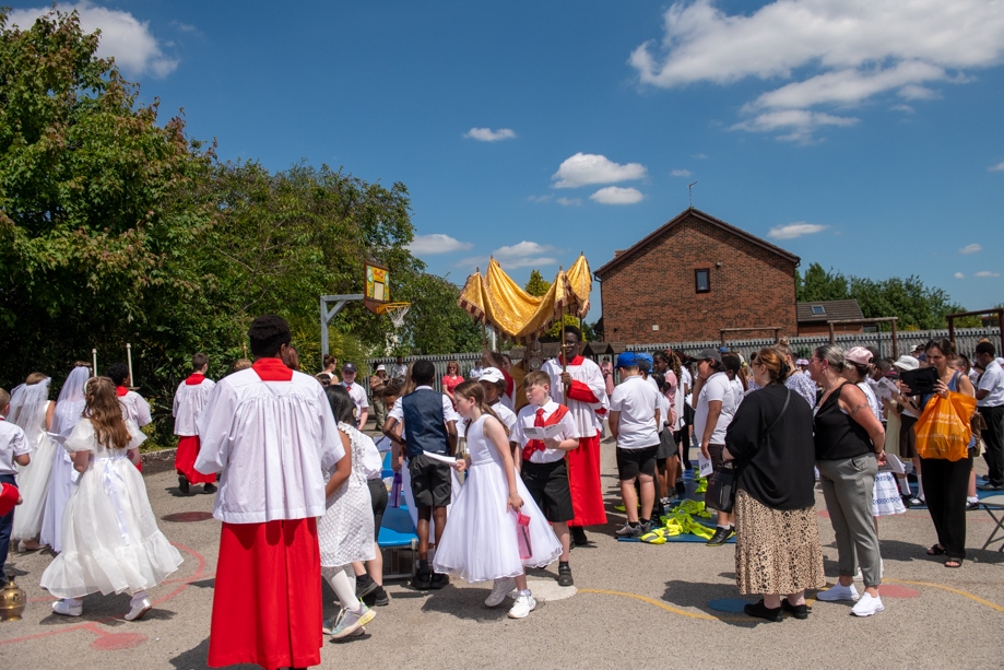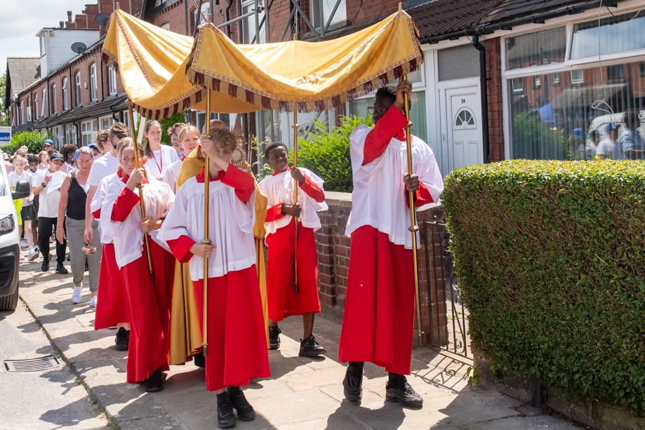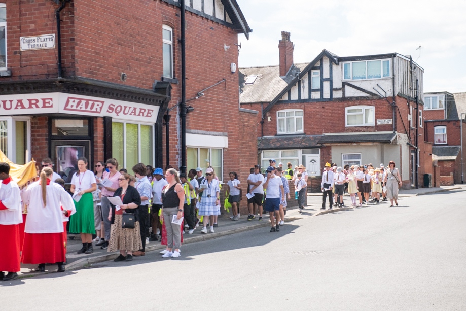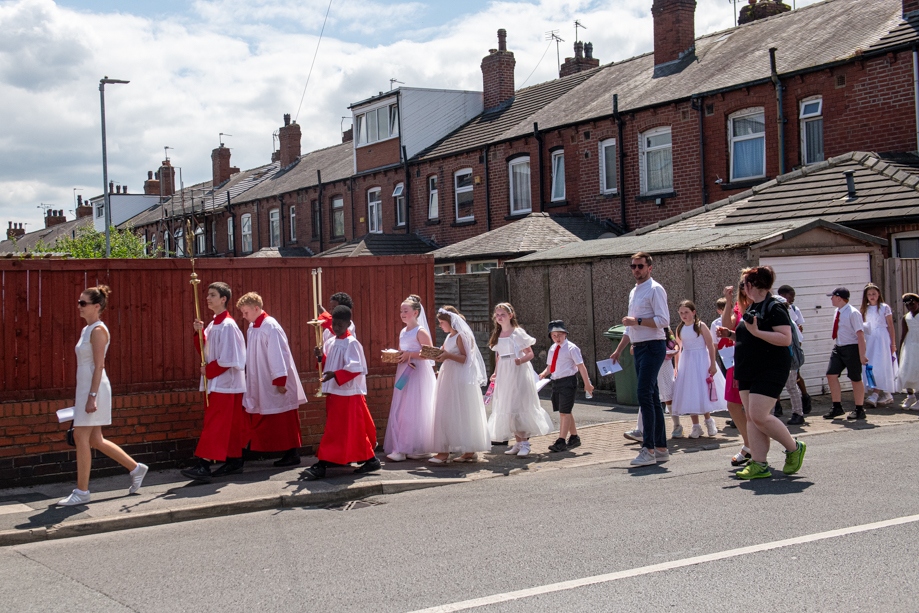 On Monday 24 June 2024, the Corpus Christi Procession took place through the streets of Beeston between St Anthony’s Catholic Primary School, Beeston and St Francis Of Assisi Catholic Primary School in St Maximilian Kolbe Parish, Leeds.