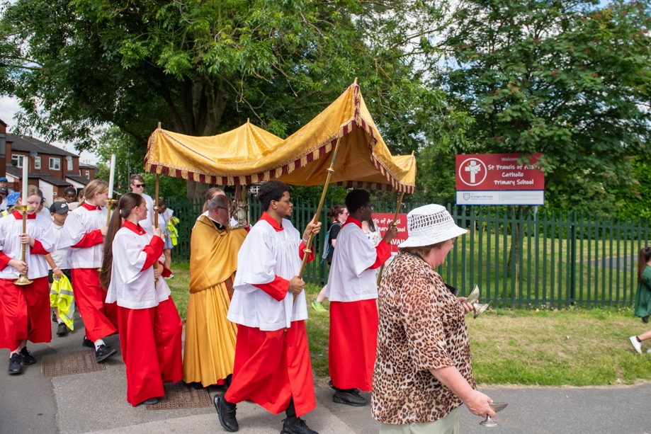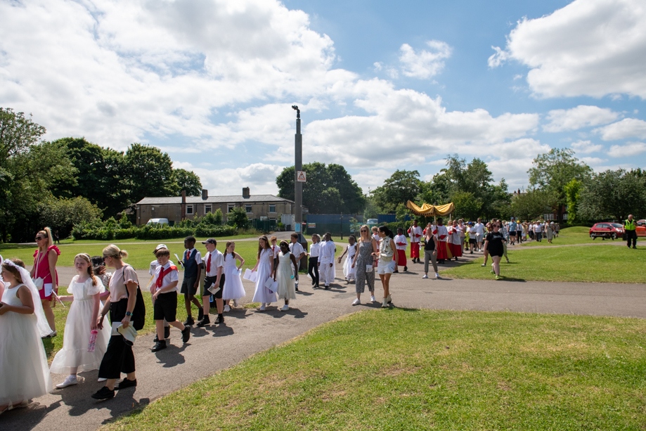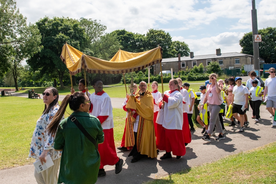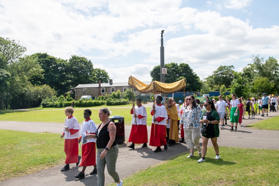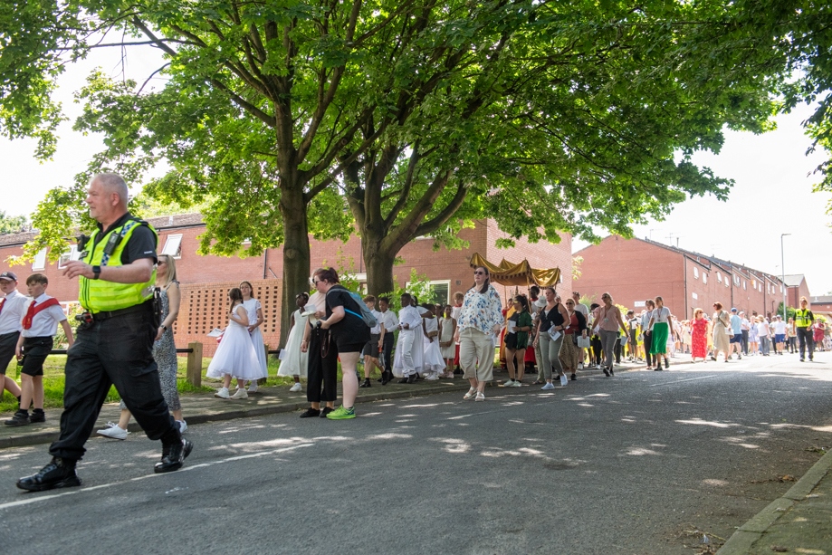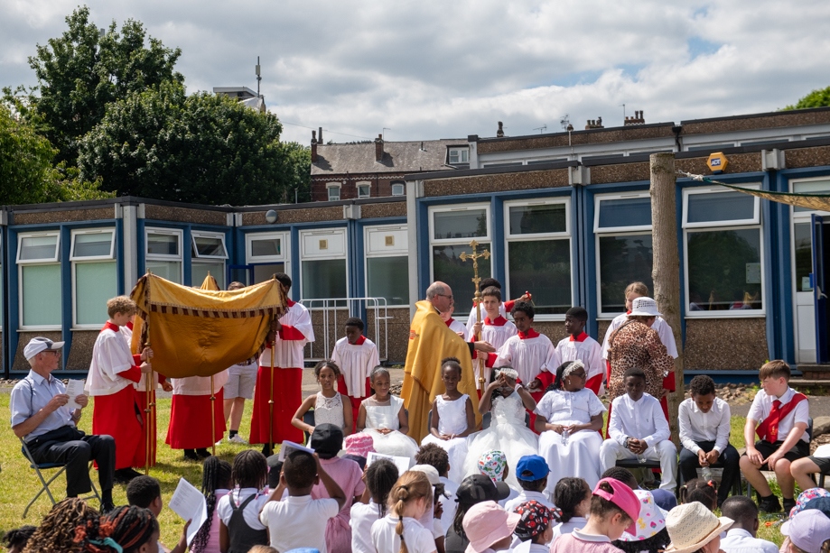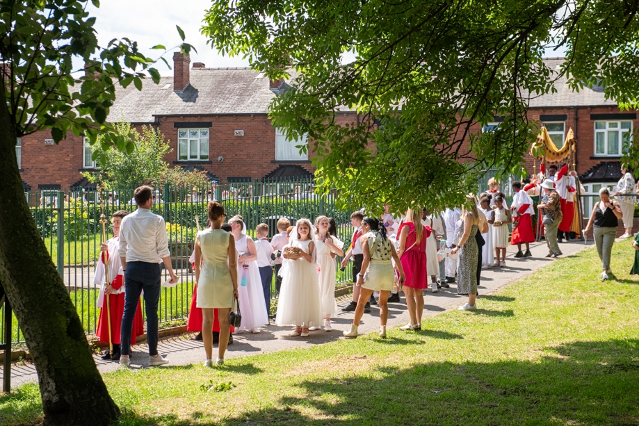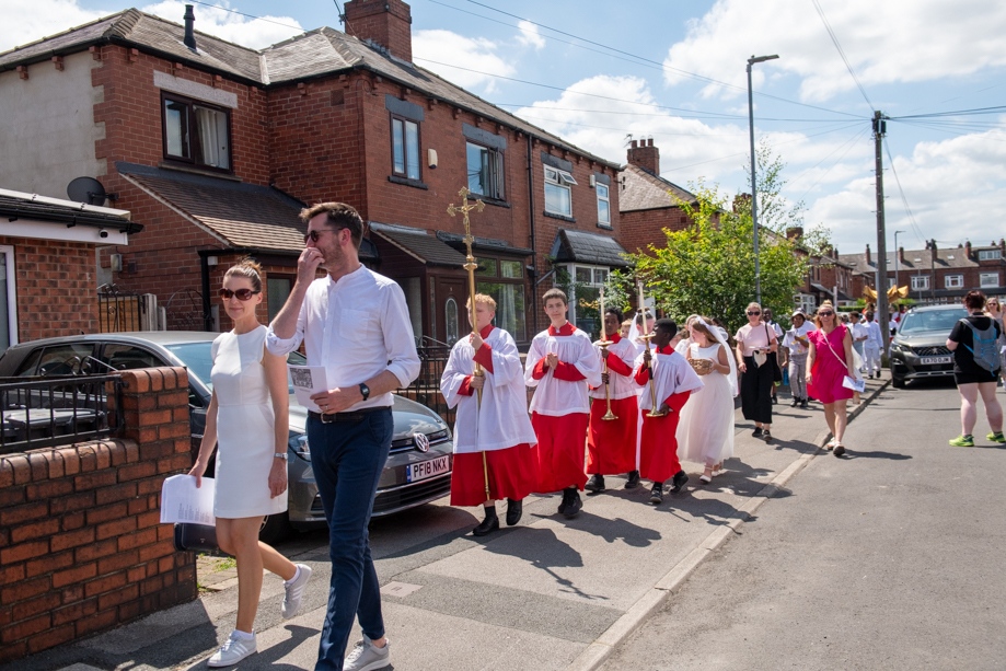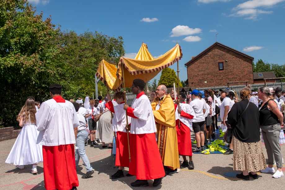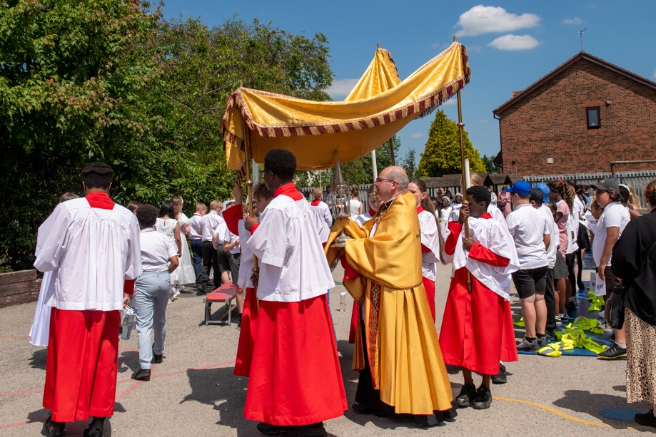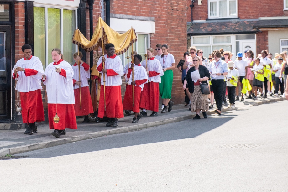 On Monday 24 June 2024, the Corpus Christi Procession took place through the streets of Beeston between St Anthony’s Catholic Primary School, Beeston and St Francis Of Assisi Catholic Primary School in St Maximilian Kolbe Parish, Leeds.
