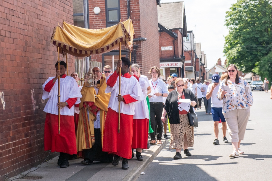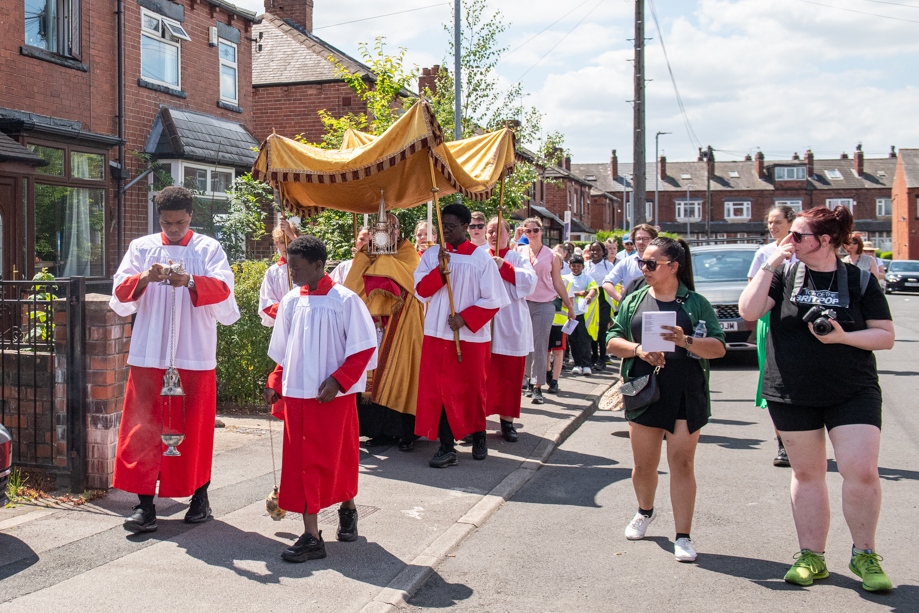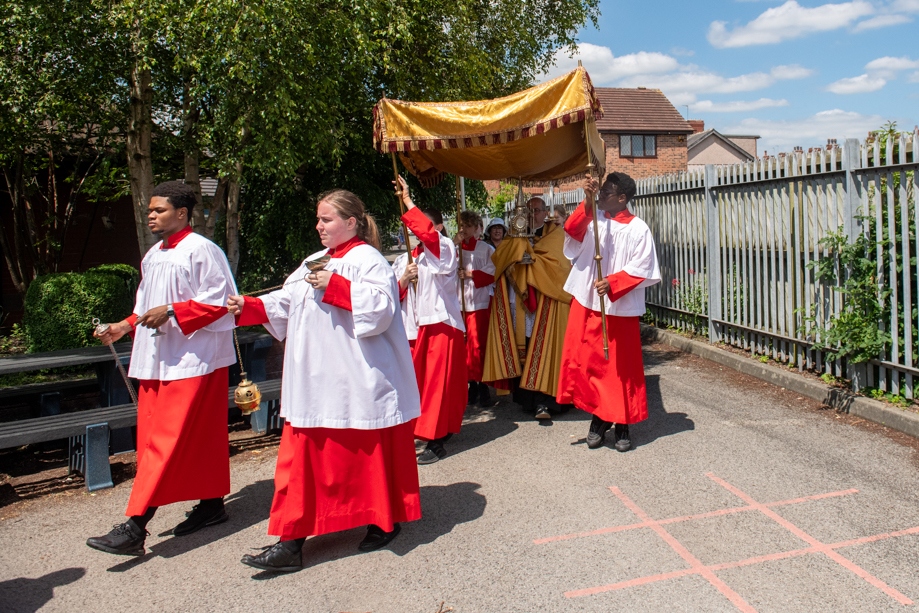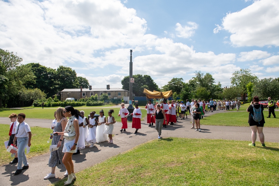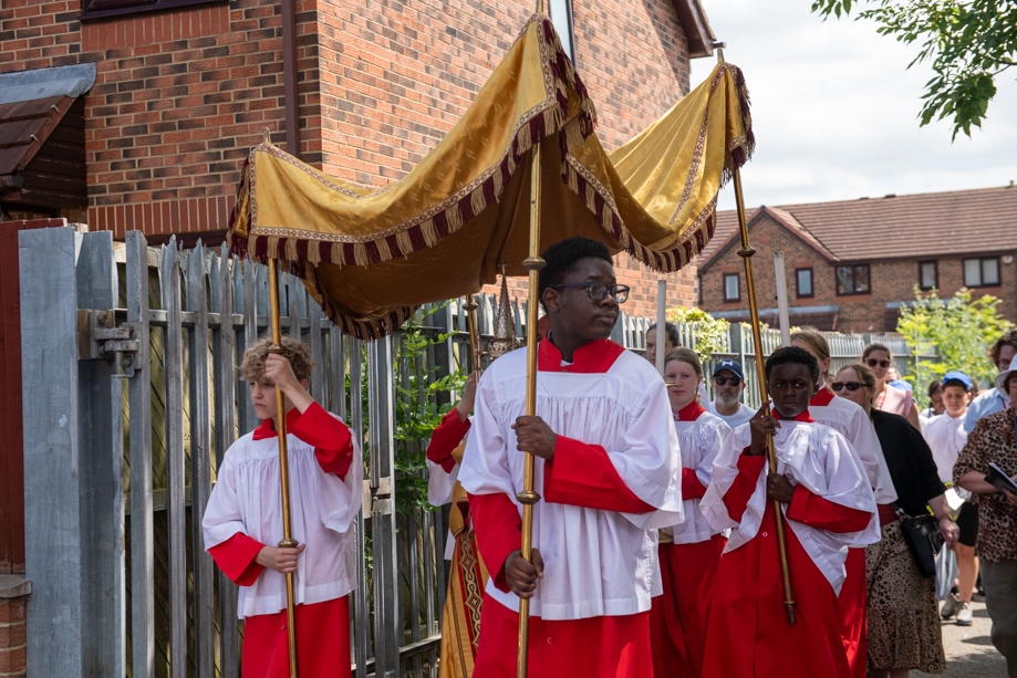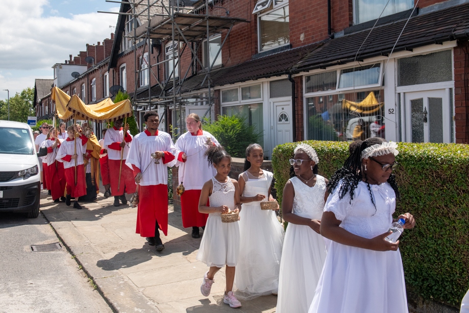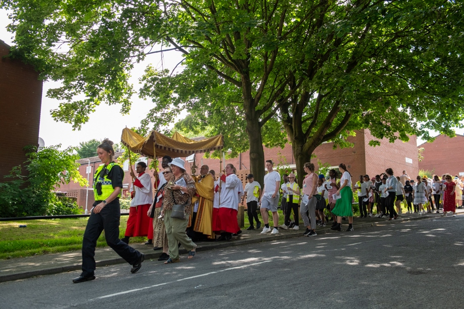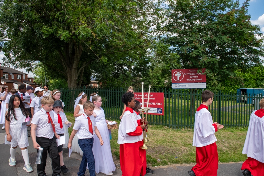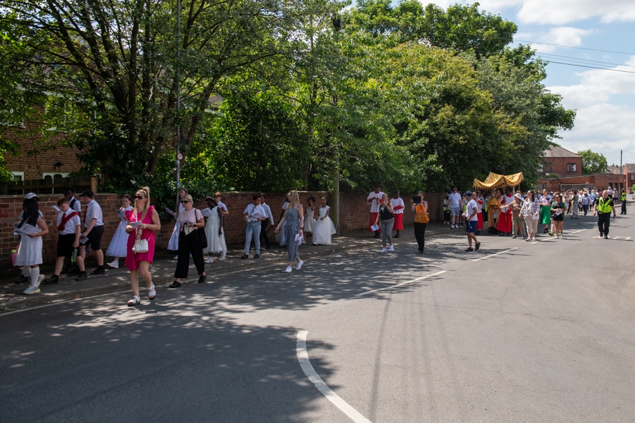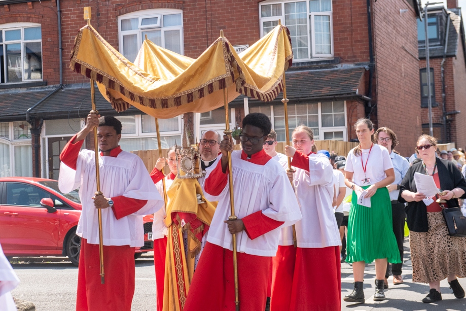 On Monday 24 June 2024, the Corpus Christi Procession took place through the streets of Beeston between St Anthony’s Catholic Primary School, Beeston and St Francis Of Assisi Catholic Primary School in St Maximilian Kolbe Parish, Leeds.