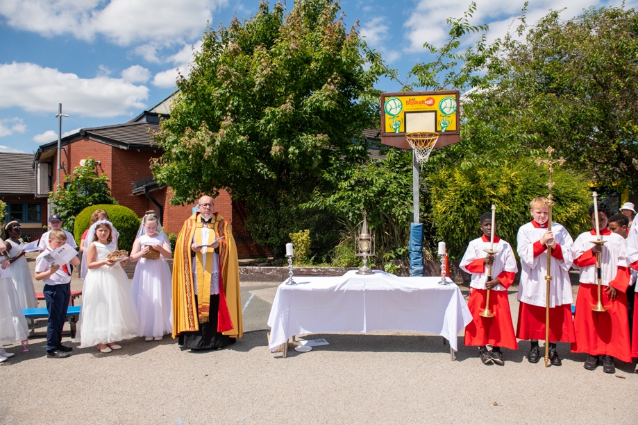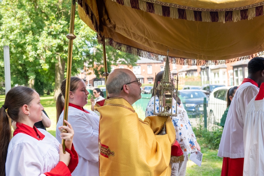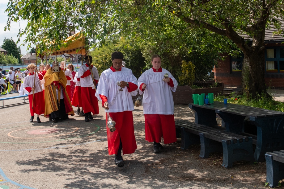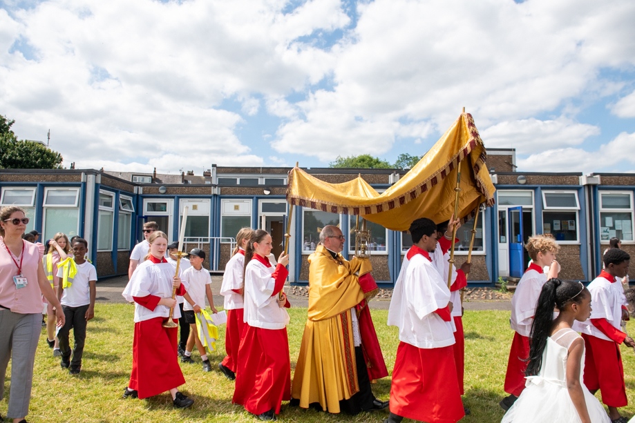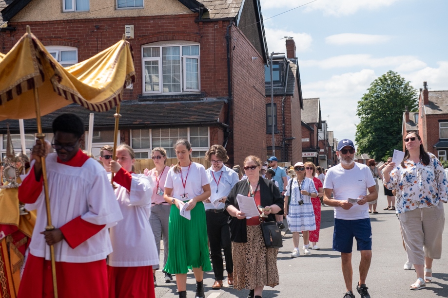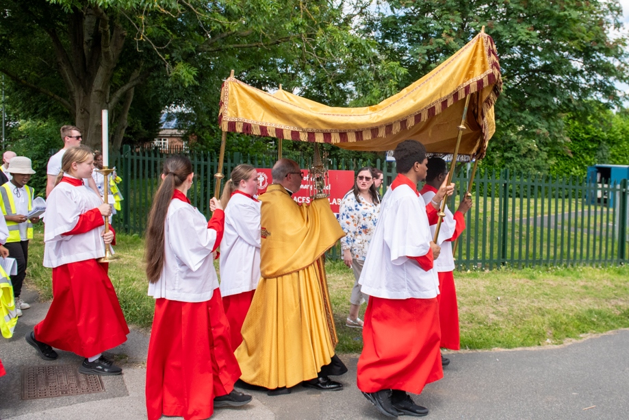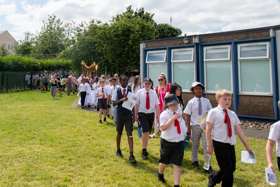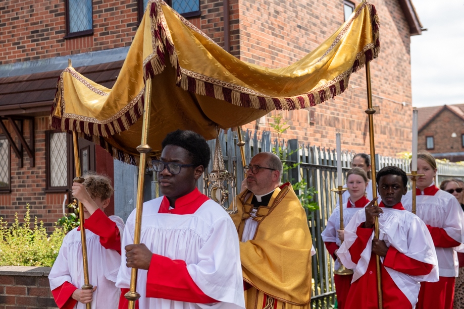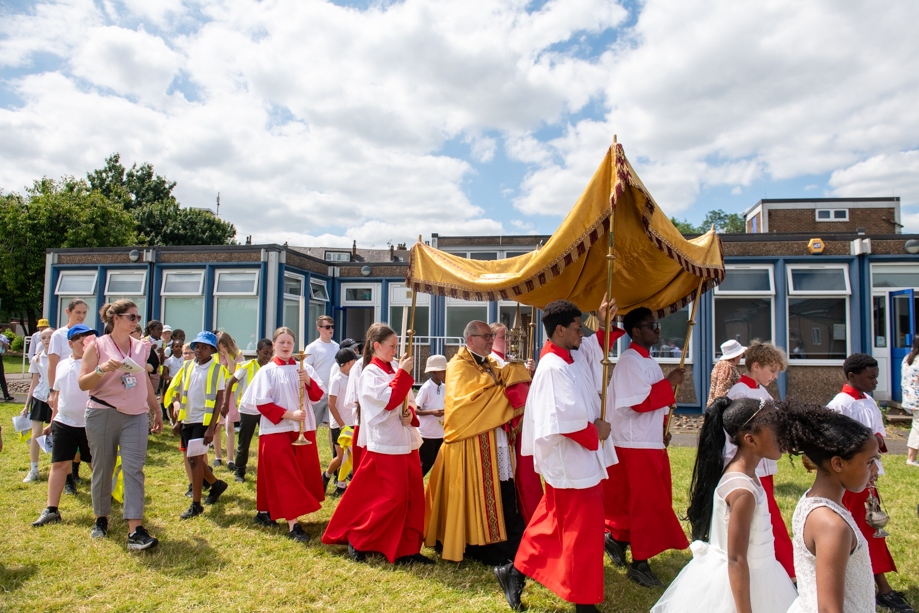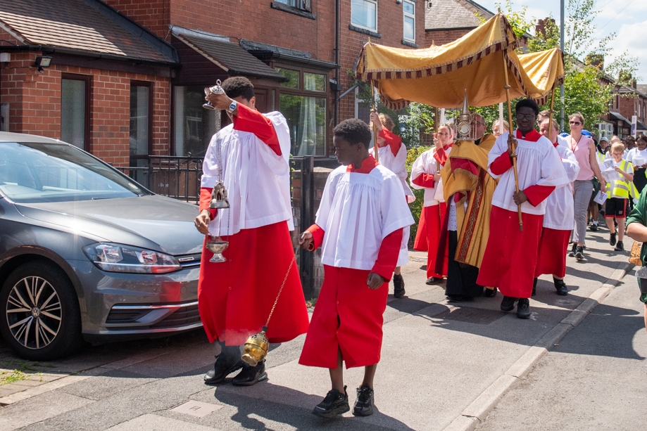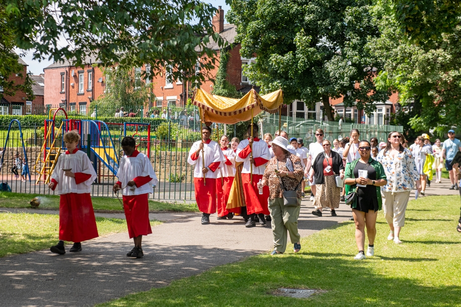 On Monday 24 June 2024, the Corpus Christi Procession took place through the streets of Beeston between St Anthony’s Catholic Primary School, Beeston and St Francis Of Assisi Catholic Primary School in St Maximilian Kolbe Parish, Leeds.