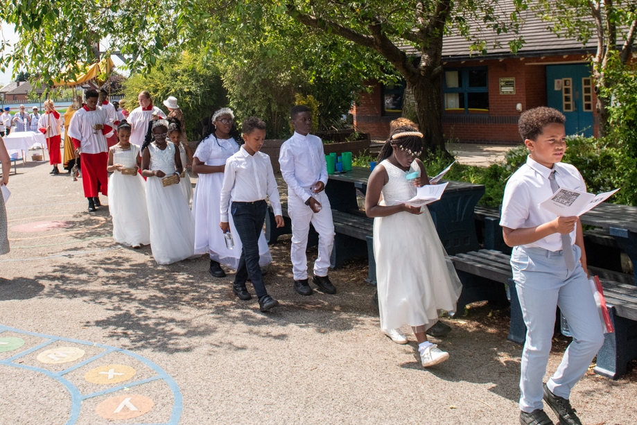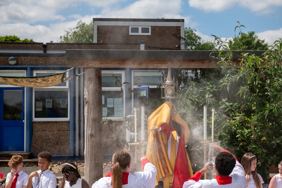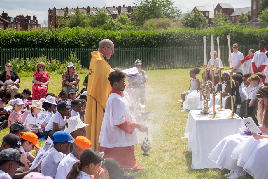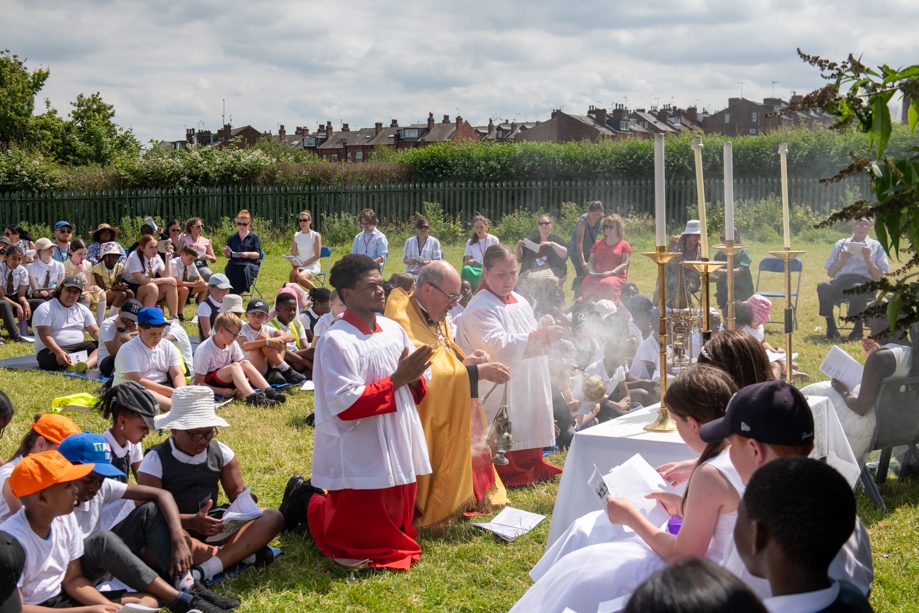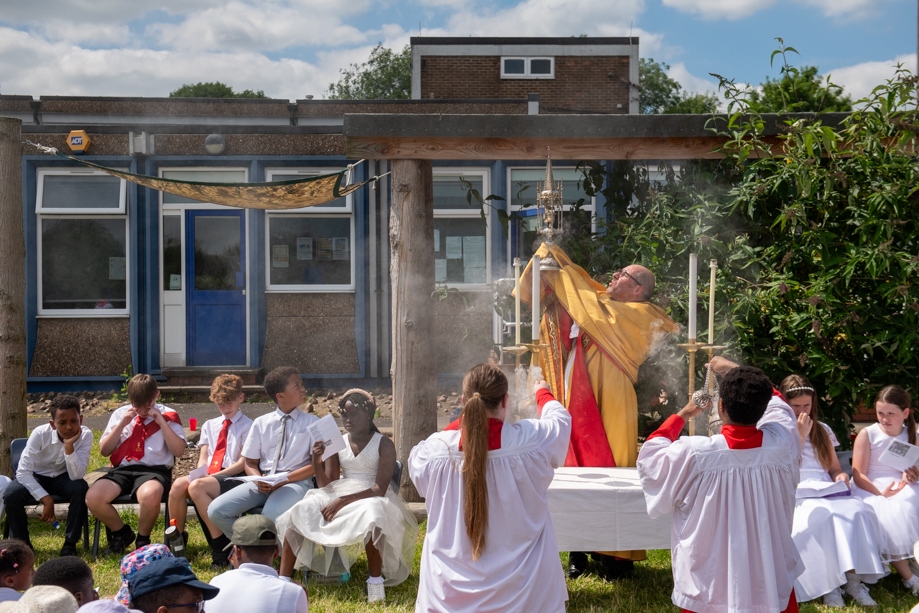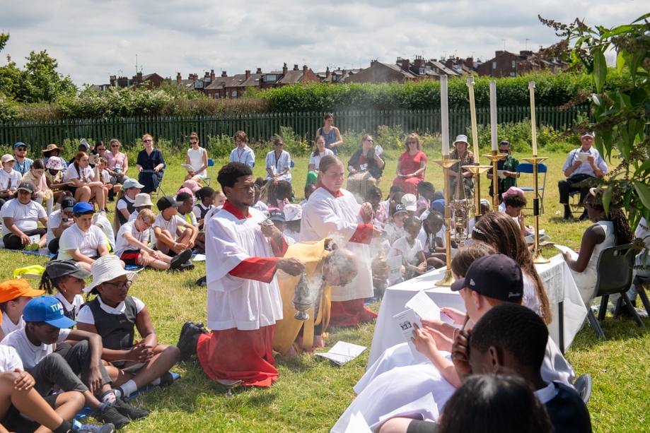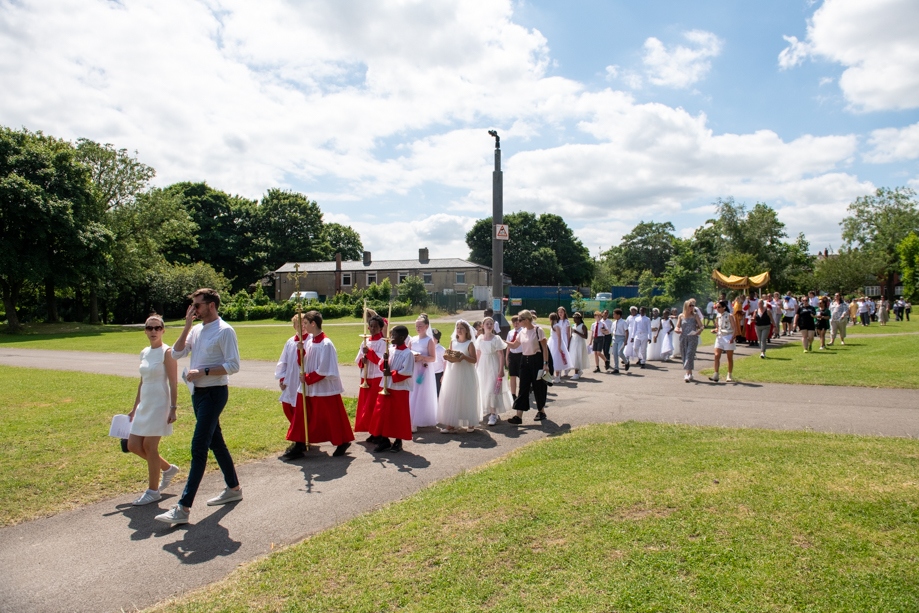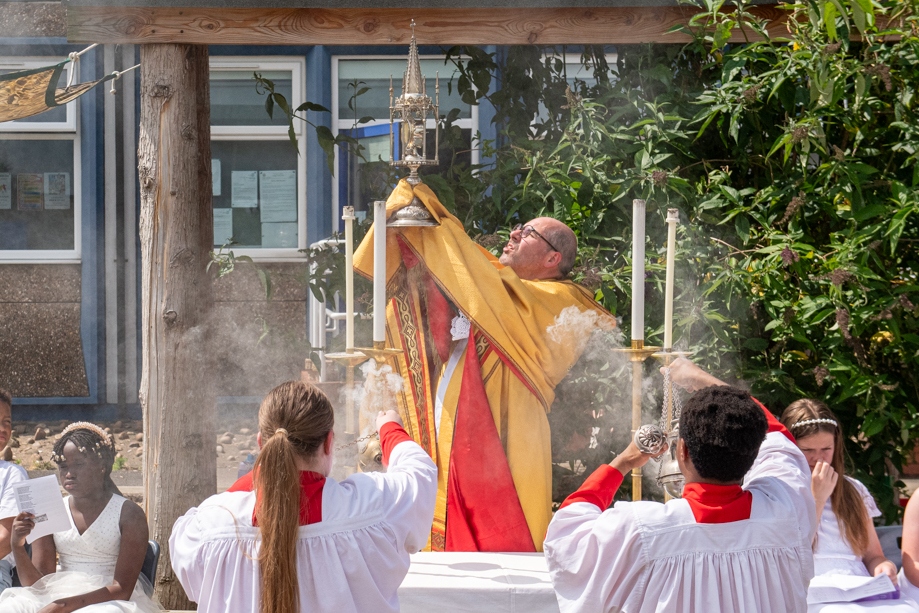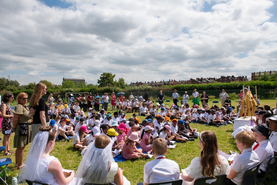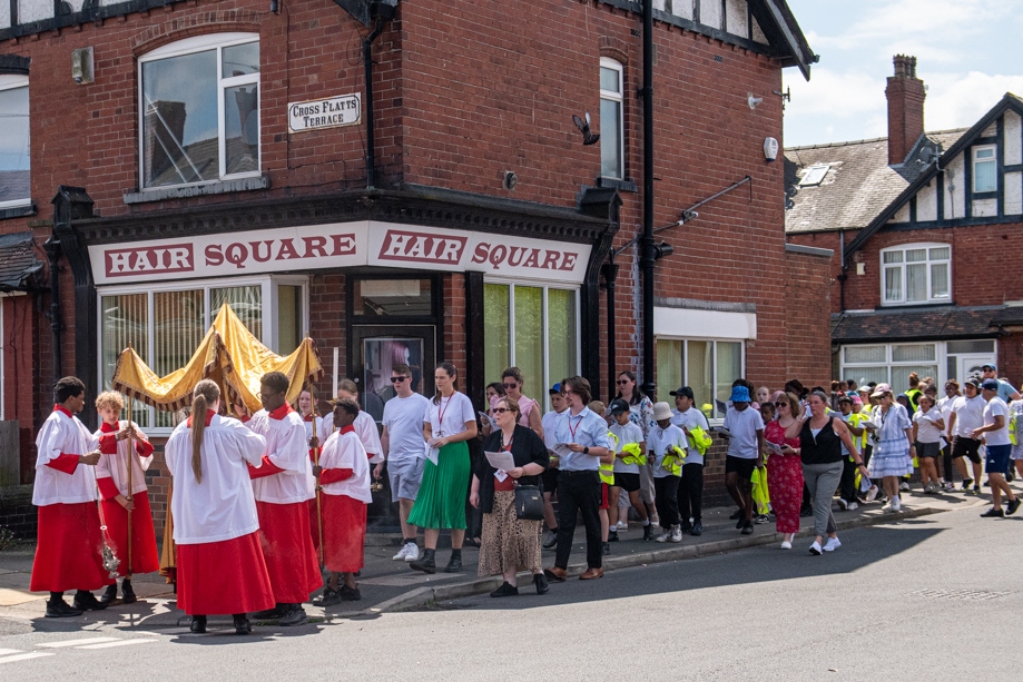 On Monday 24 June 2024, the Corpus Christi Procession took place through the streets of Beeston between St Anthony’s Catholic Primary School, Beeston and St Francis Of Assisi Catholic Primary School in St Maximilian Kolbe Parish, Leeds.
