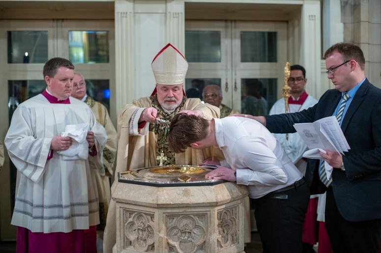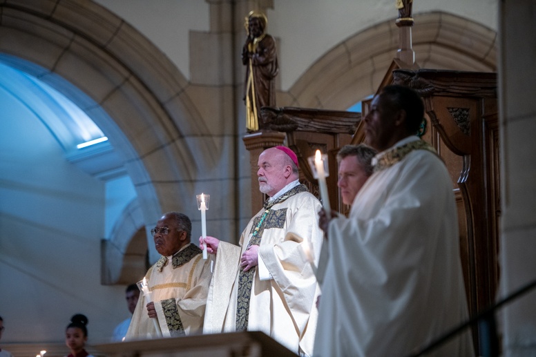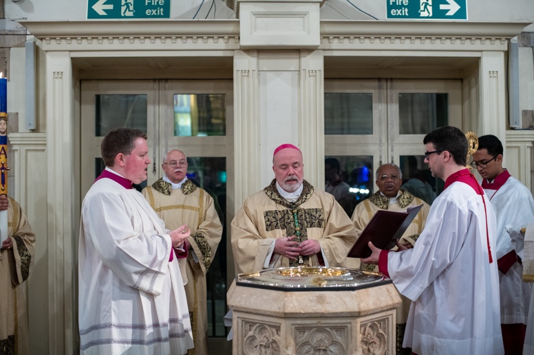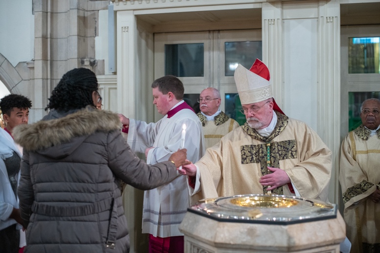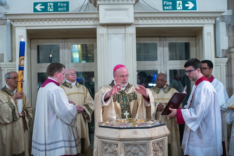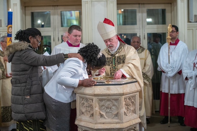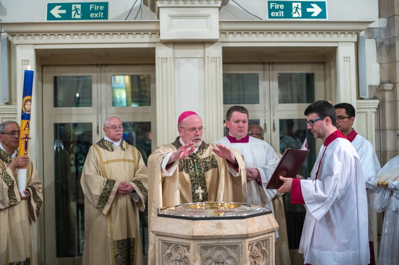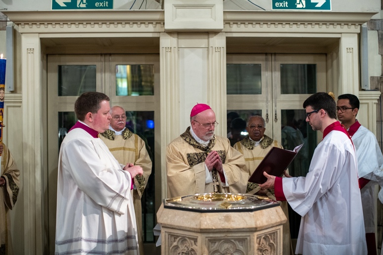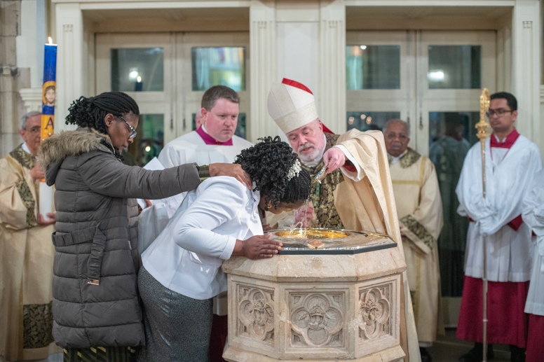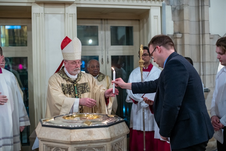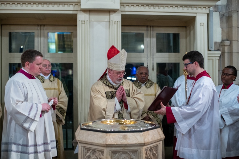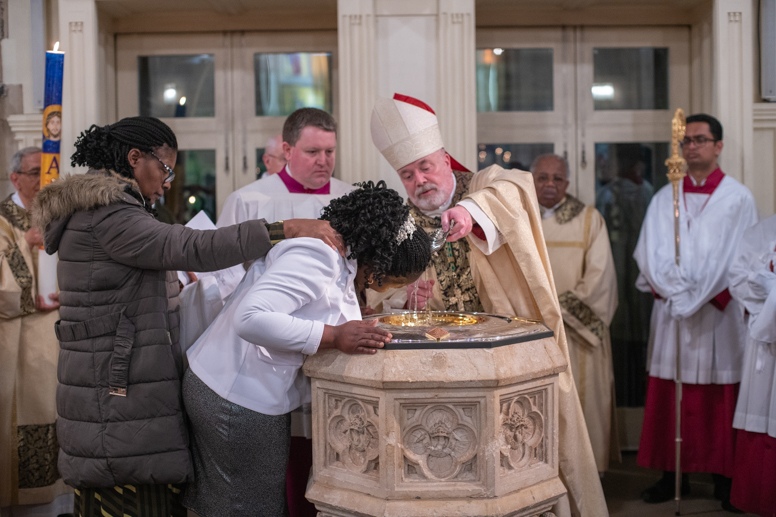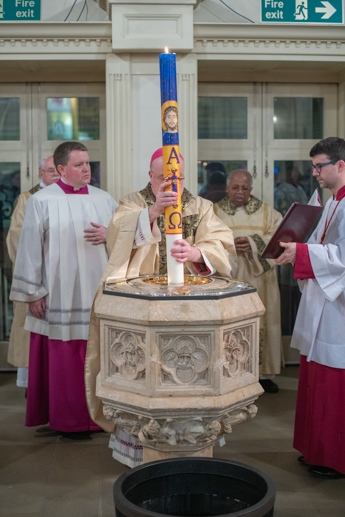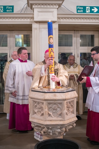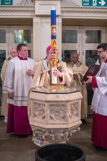 The Blessing of the Water: Bishop Marcus dips the paschal candle into the baptismal font to bless the water followed by the baptism of nine adults.