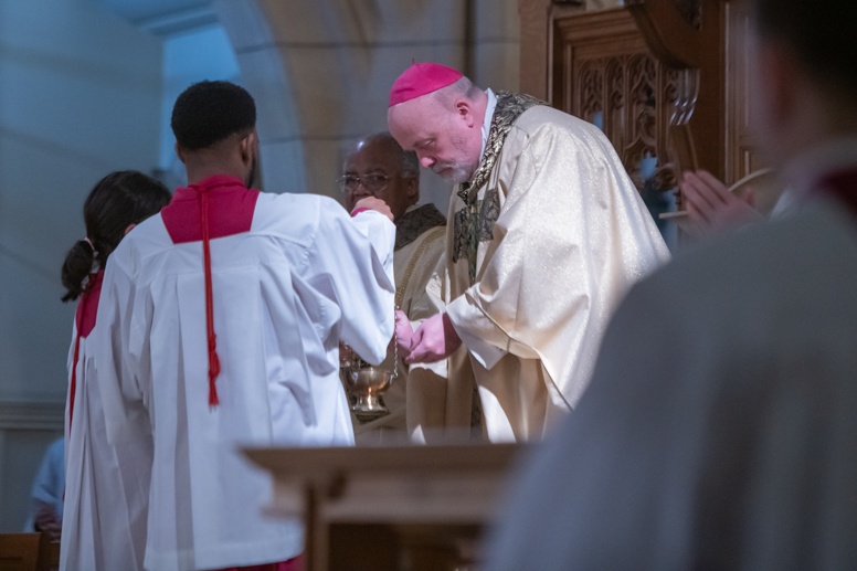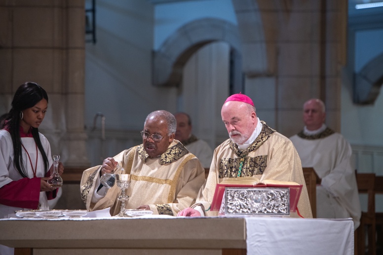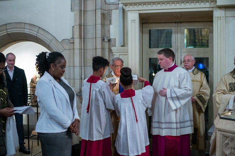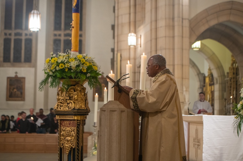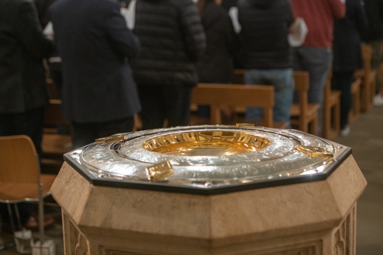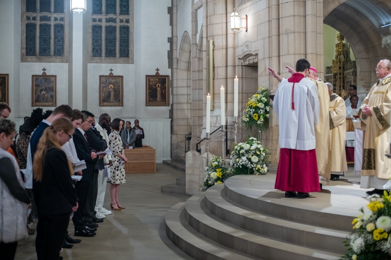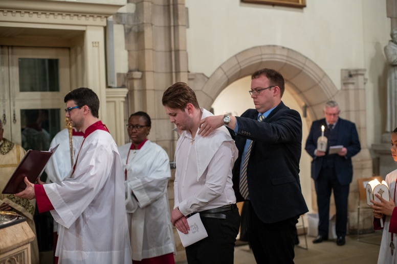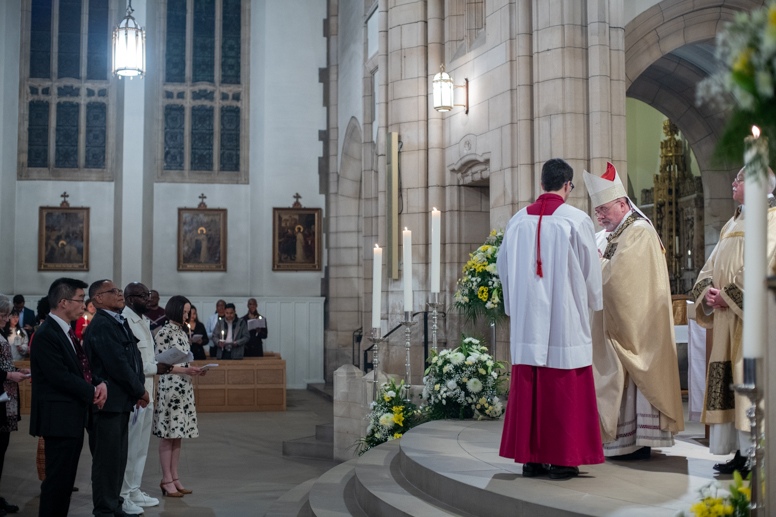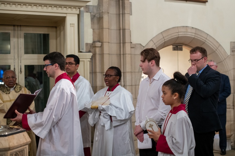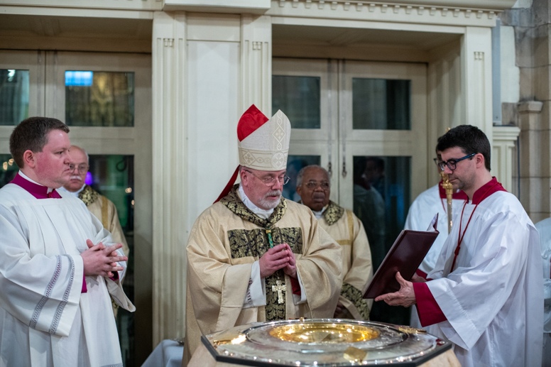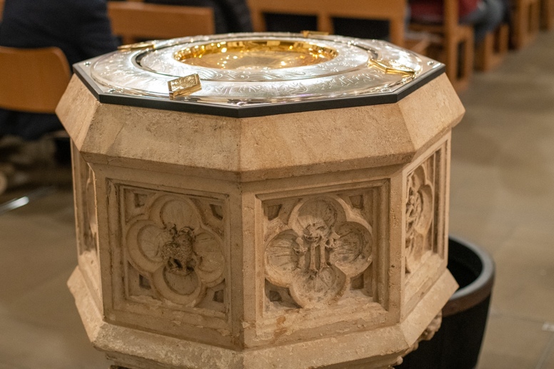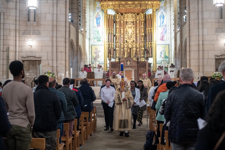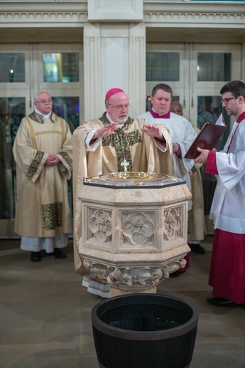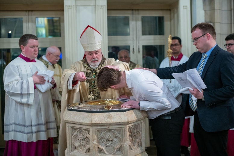The Blessing of the Water: Bishop Marcus dips the paschal candle into the baptismal font to bless the water followed by the baptism of nine adults.