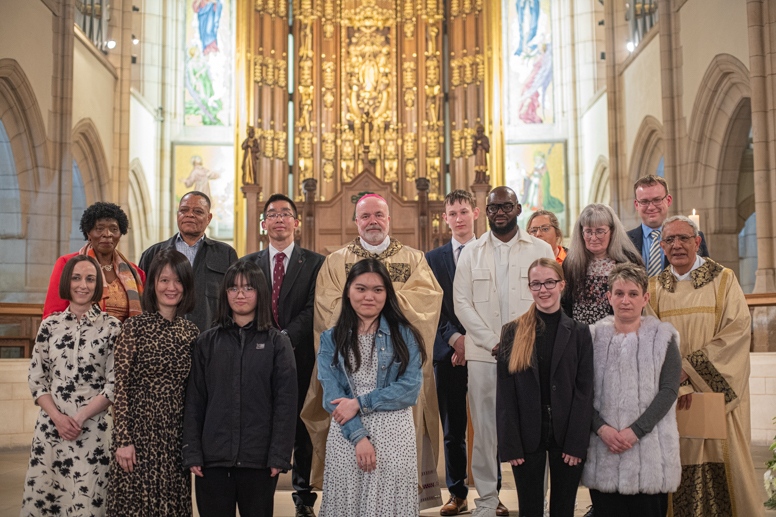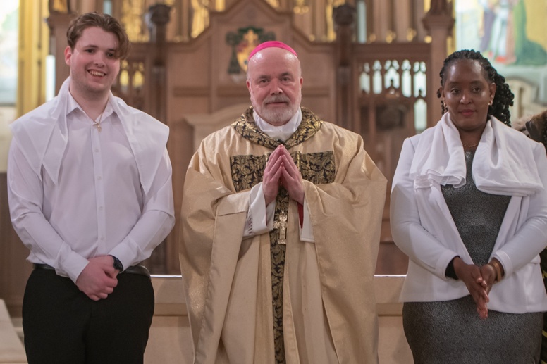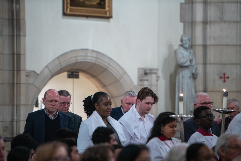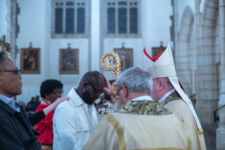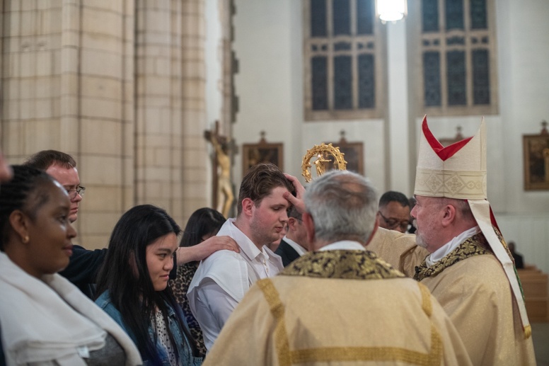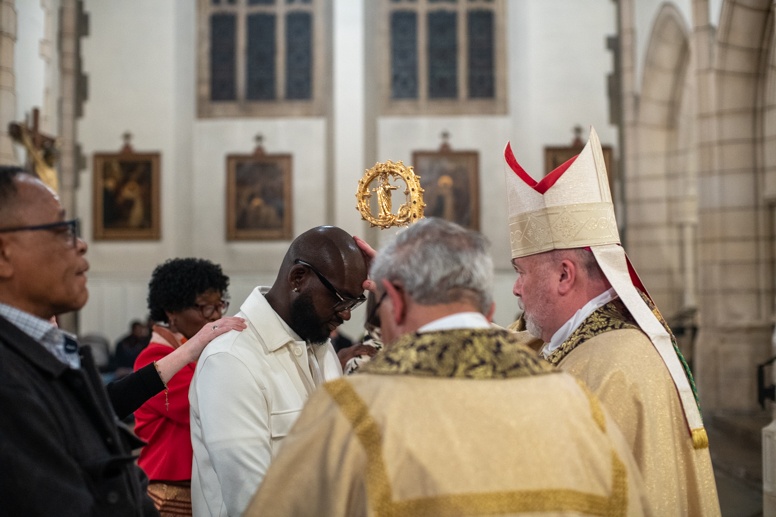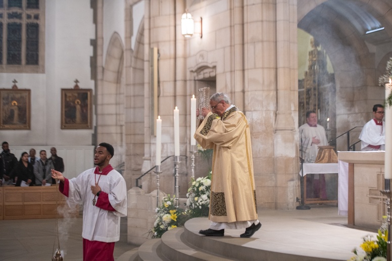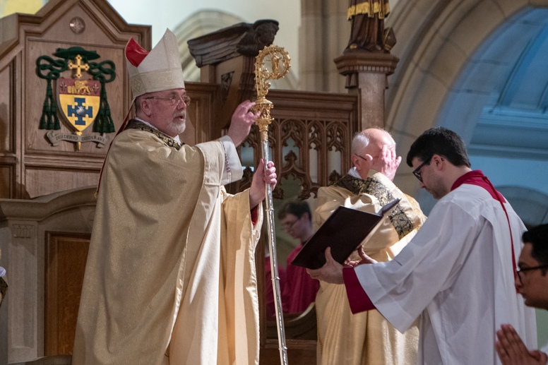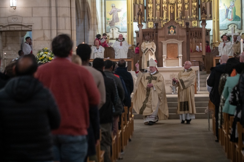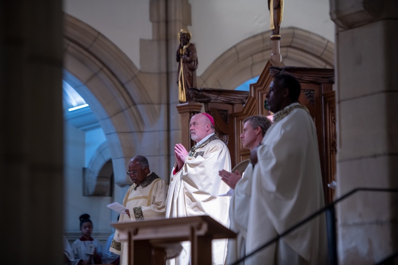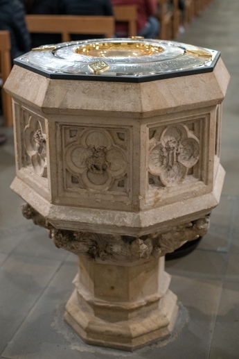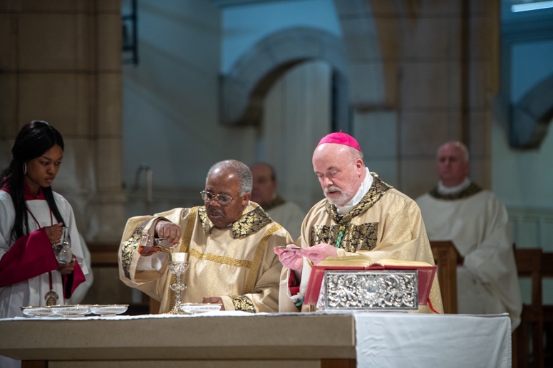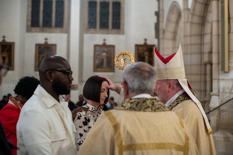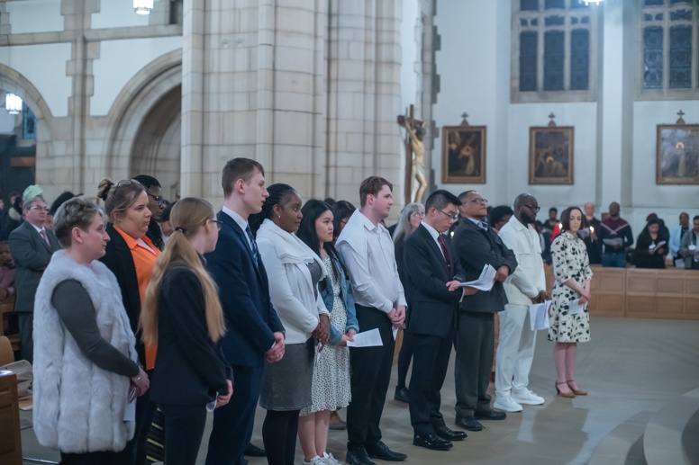 The Blessing of the Water: Bishop Marcus dips the paschal candle into the baptismal font to bless the water followed by the baptism of nine adults.