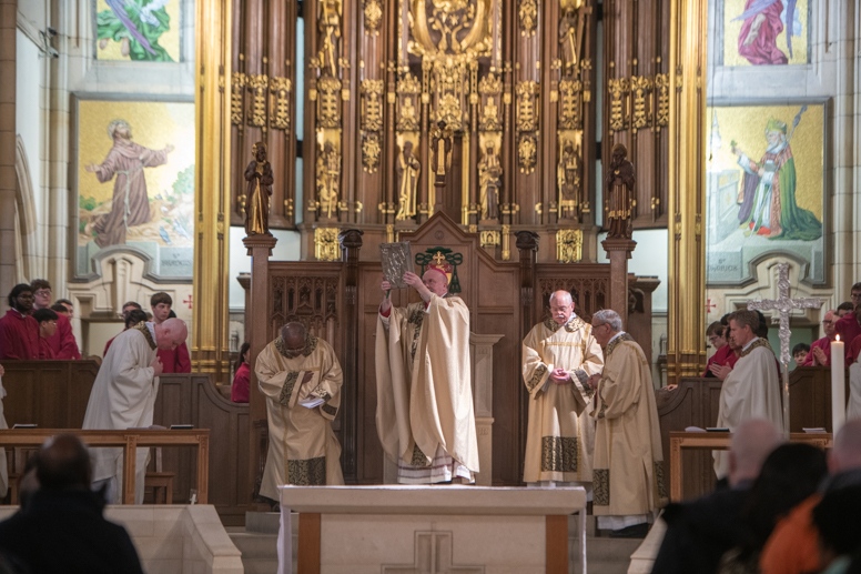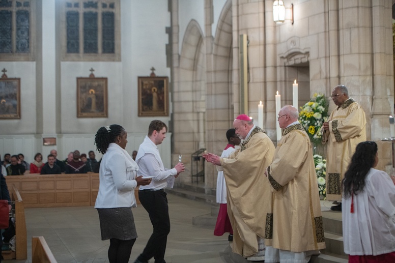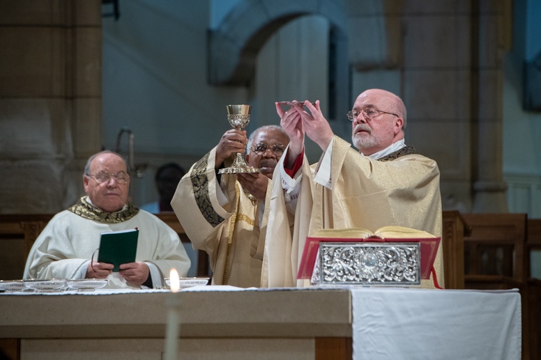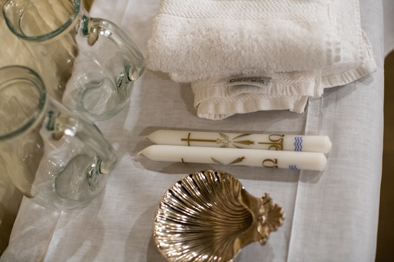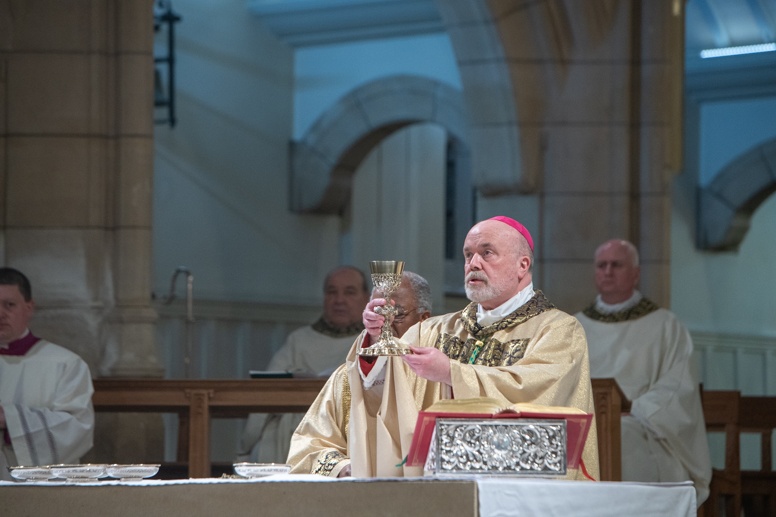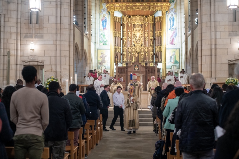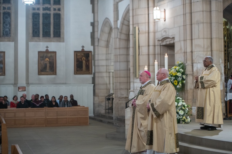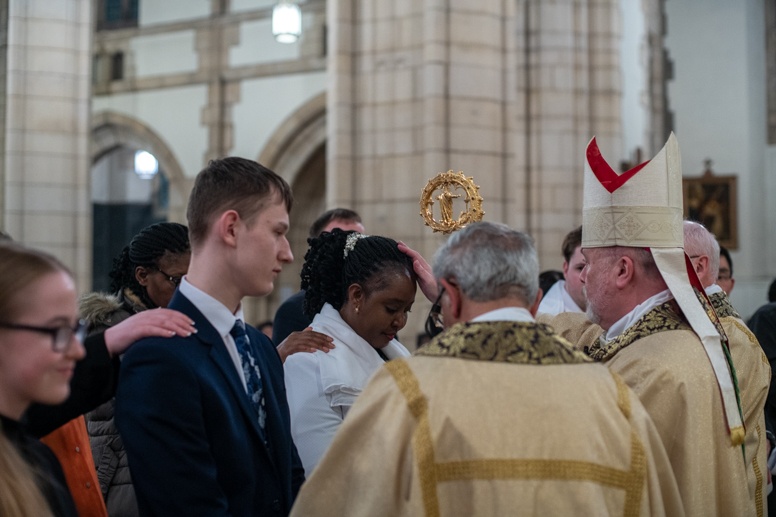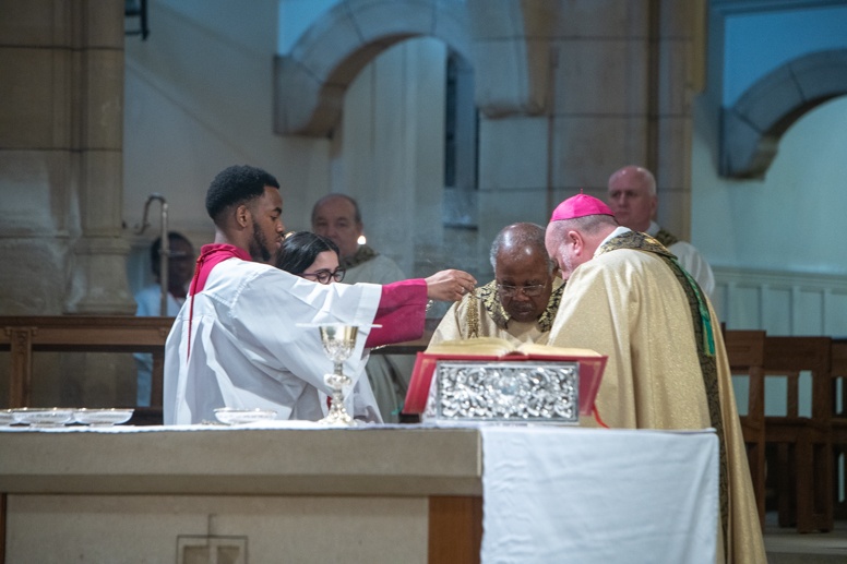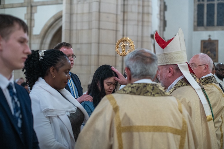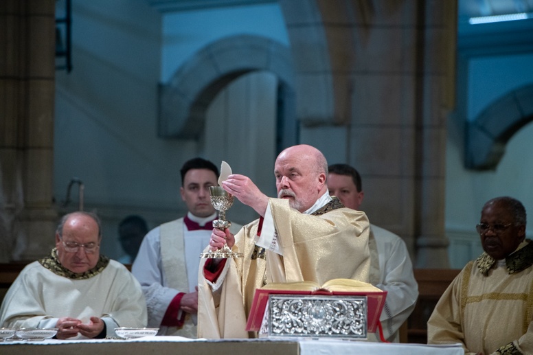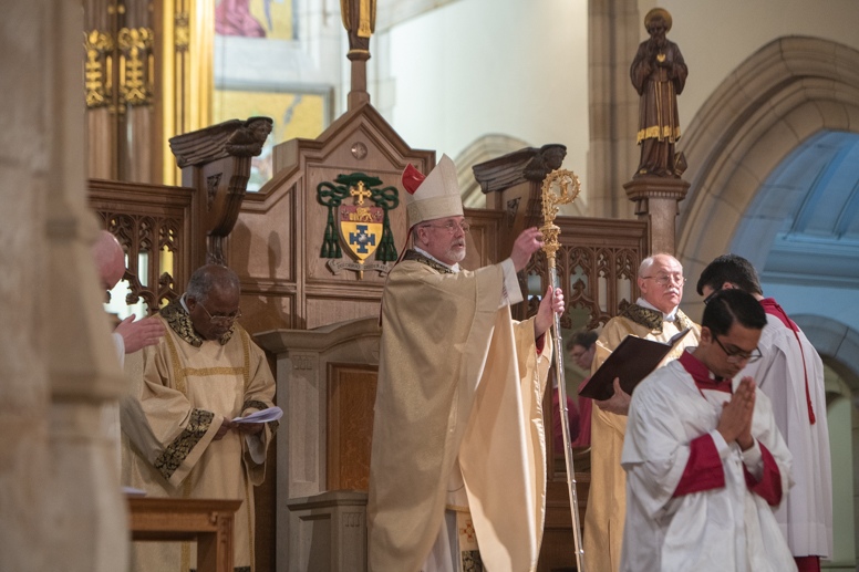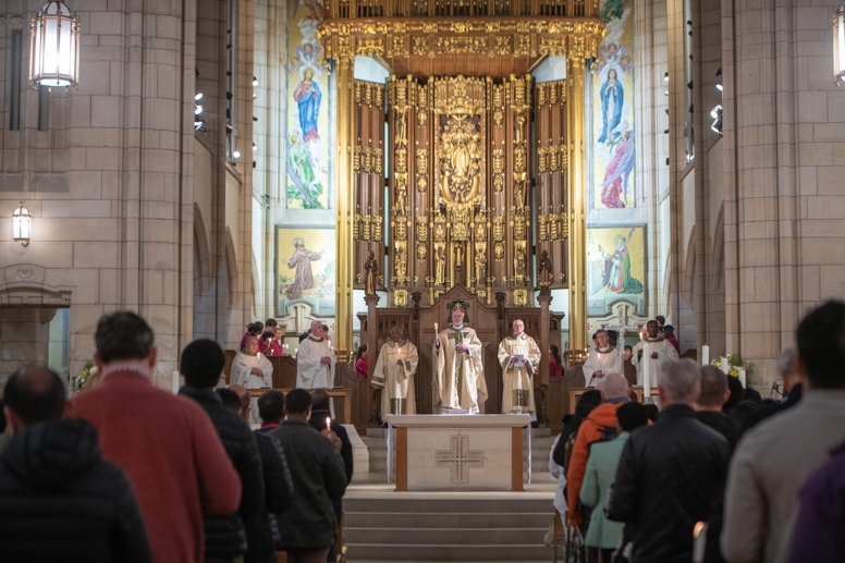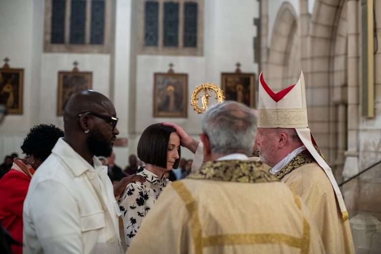 The Blessing of the Water: Bishop Marcus dips the paschal candle into the baptismal font to bless the water followed by the baptism of nine adults.