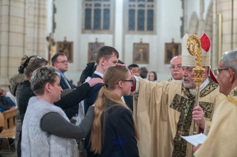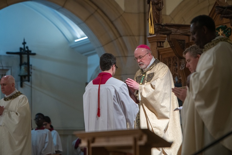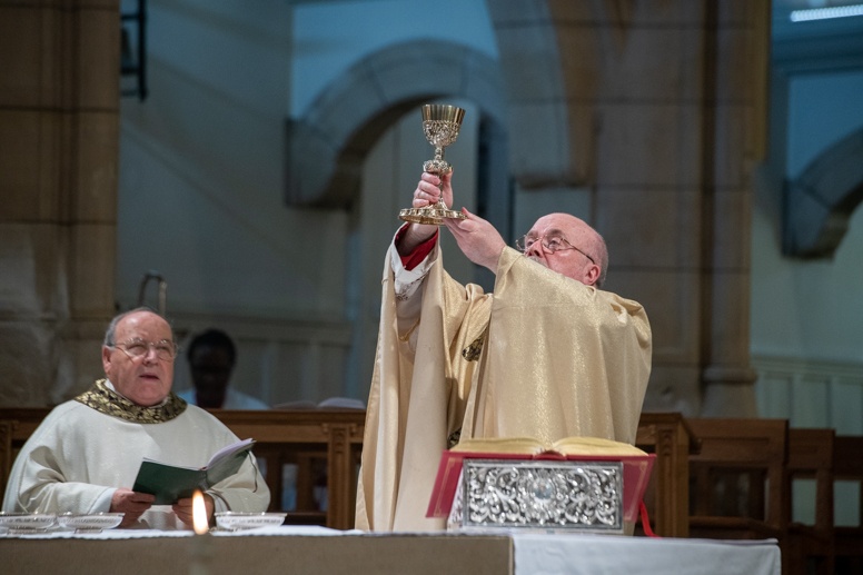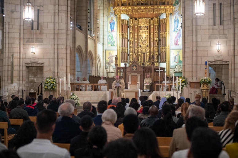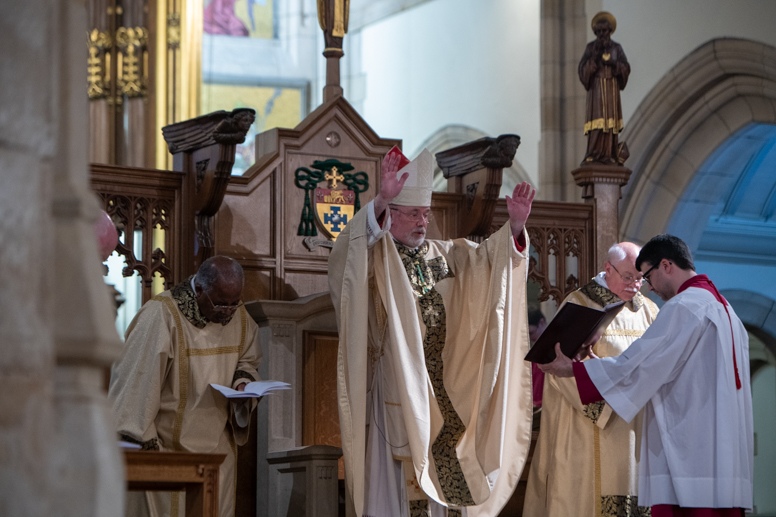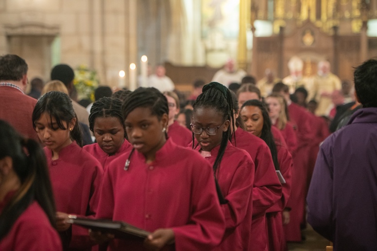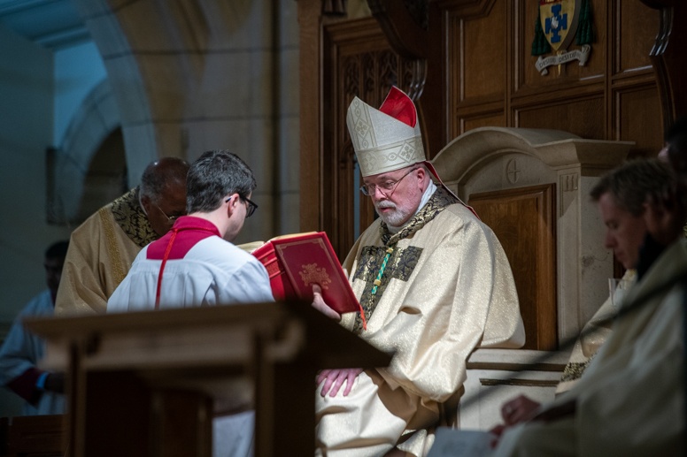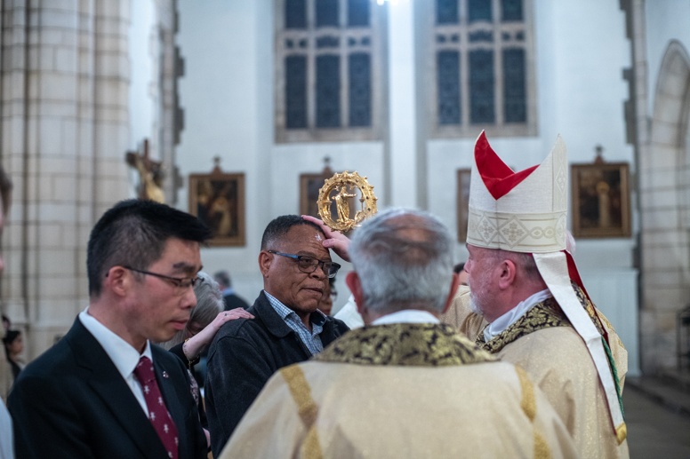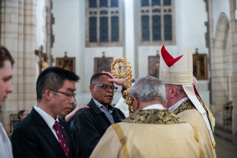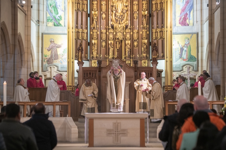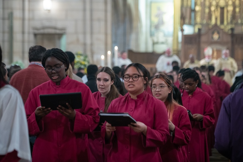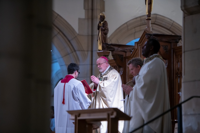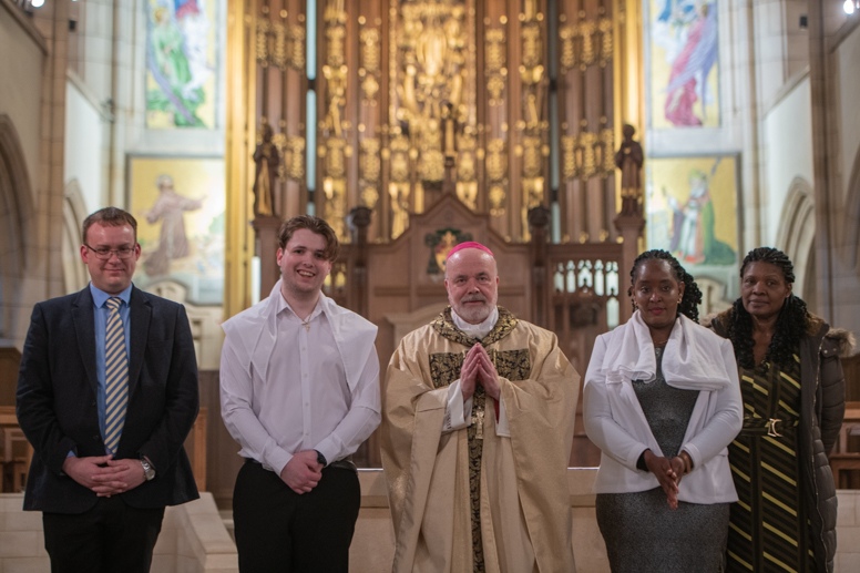 The Blessing of the Water: Bishop Marcus dips the paschal candle into the baptismal font to bless the water followed by the baptism of nine adults.