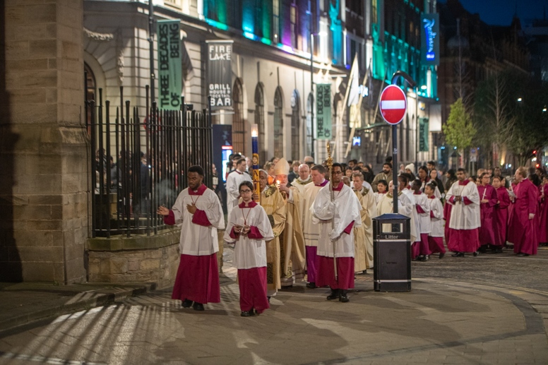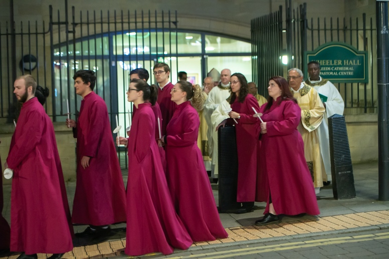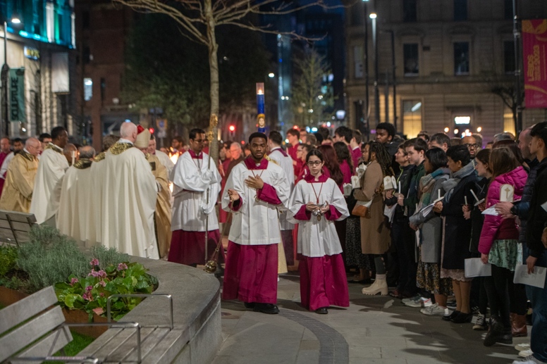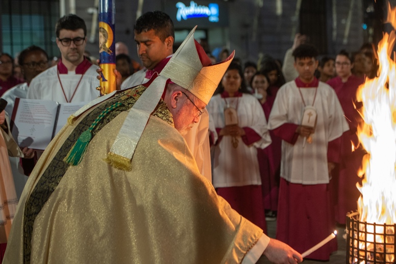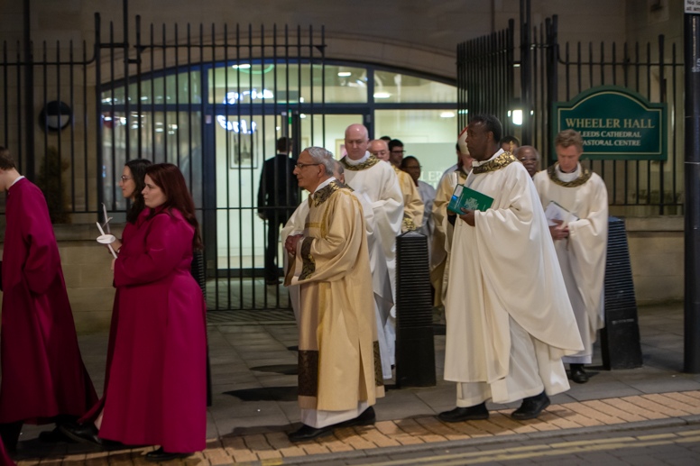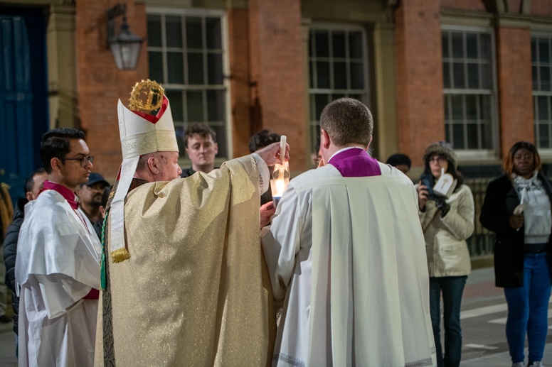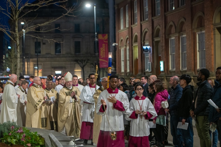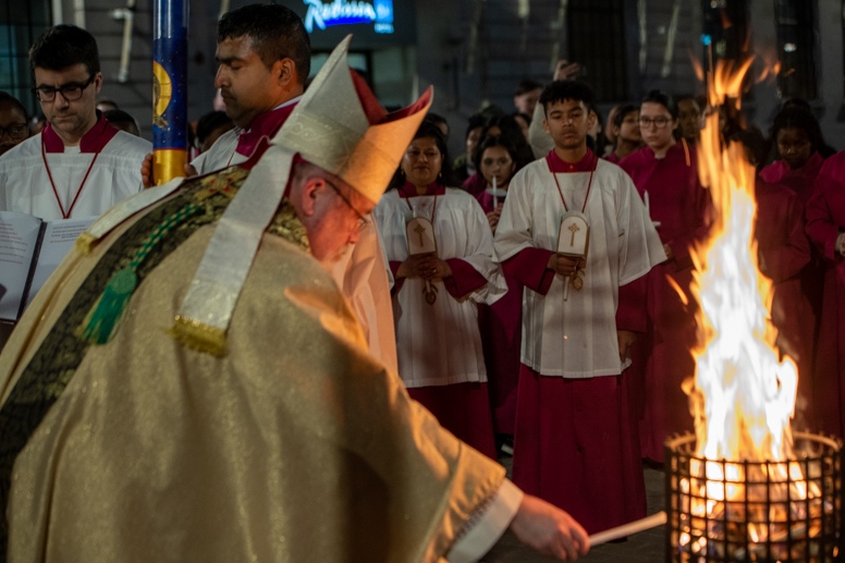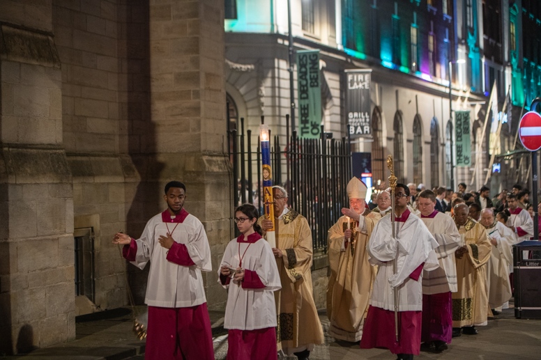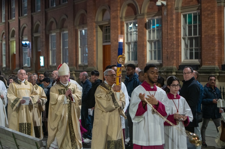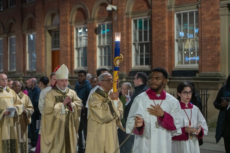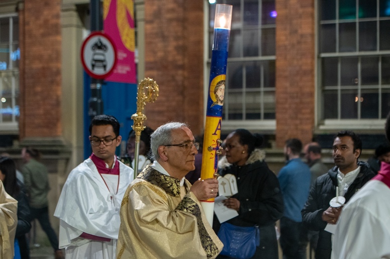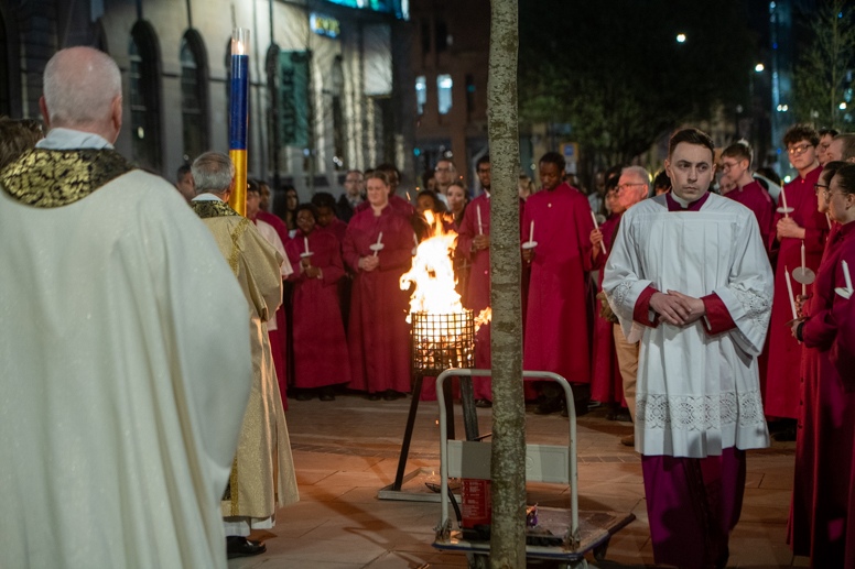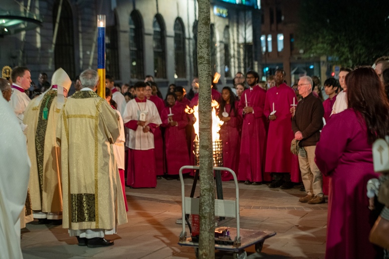 Easter Vigil began outside the Leeds Cathedral where Bishop Marcus blesses the Easter Light and ignites the paschal candle that will then light candles for the rest of the congregation.
