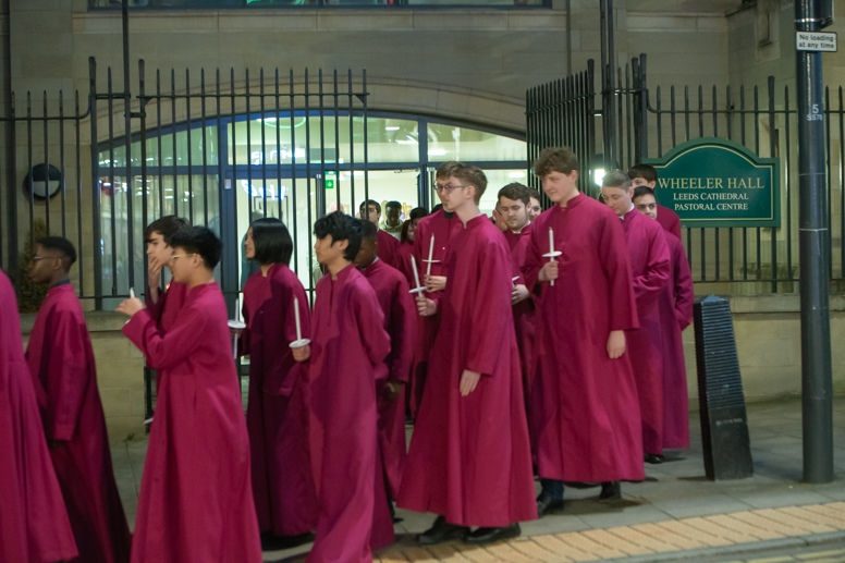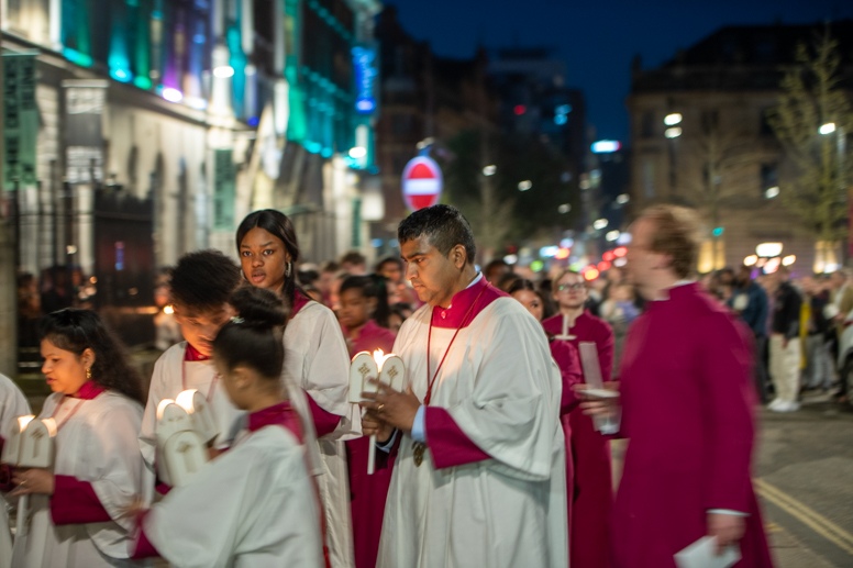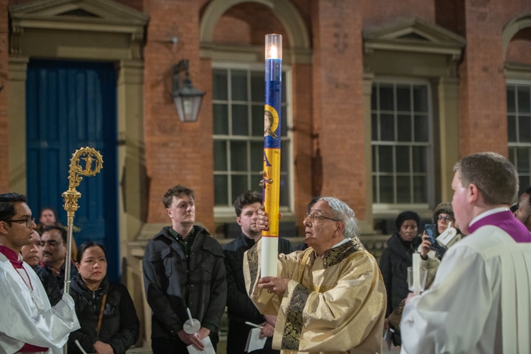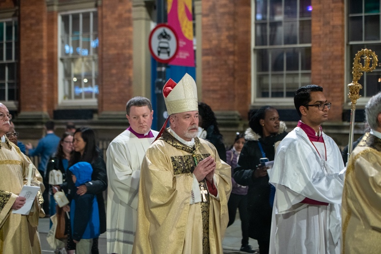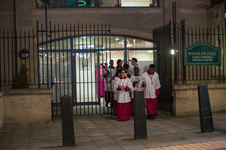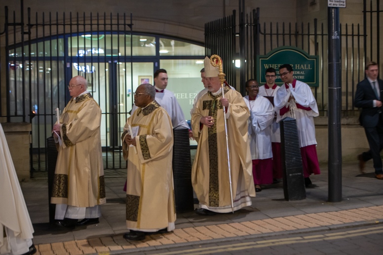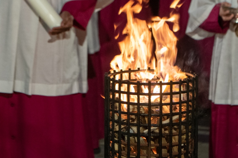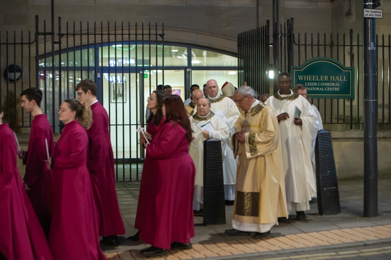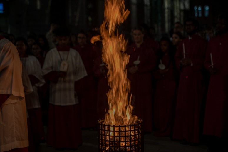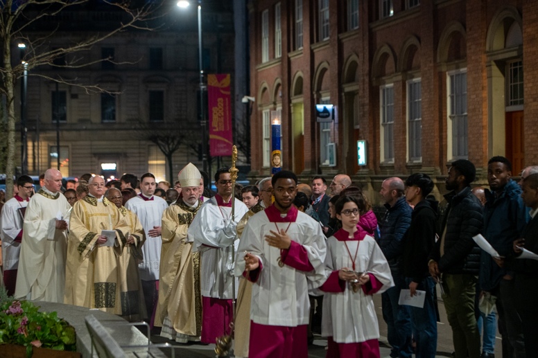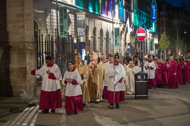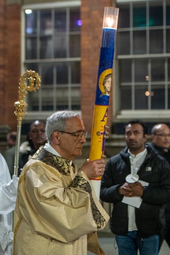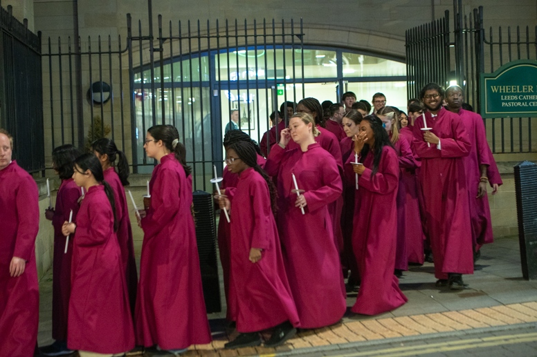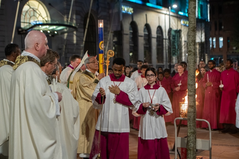 Easter Vigil began outside the Leeds Cathedral where Bishop Marcus blesses the Easter Light and ignites the paschal candle that will then light candles for the rest of the congregation.