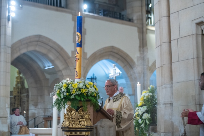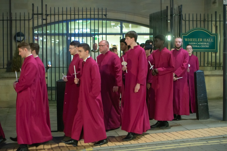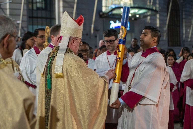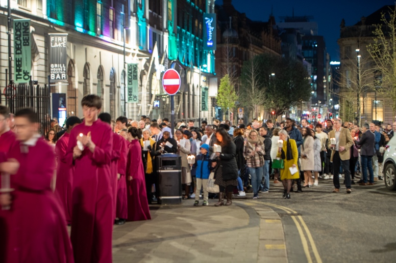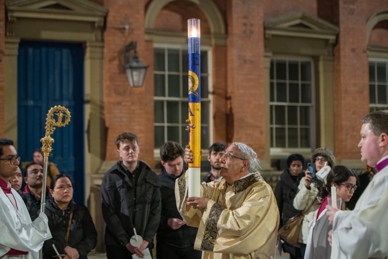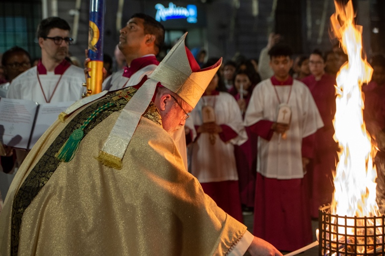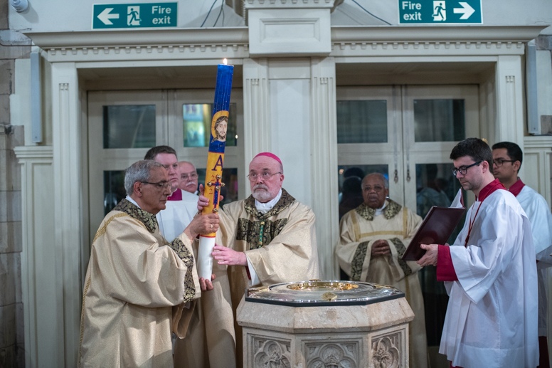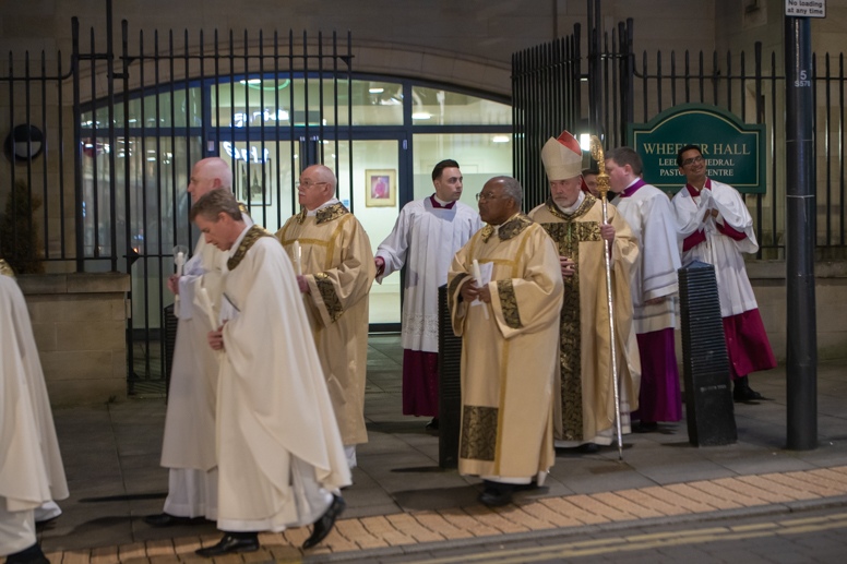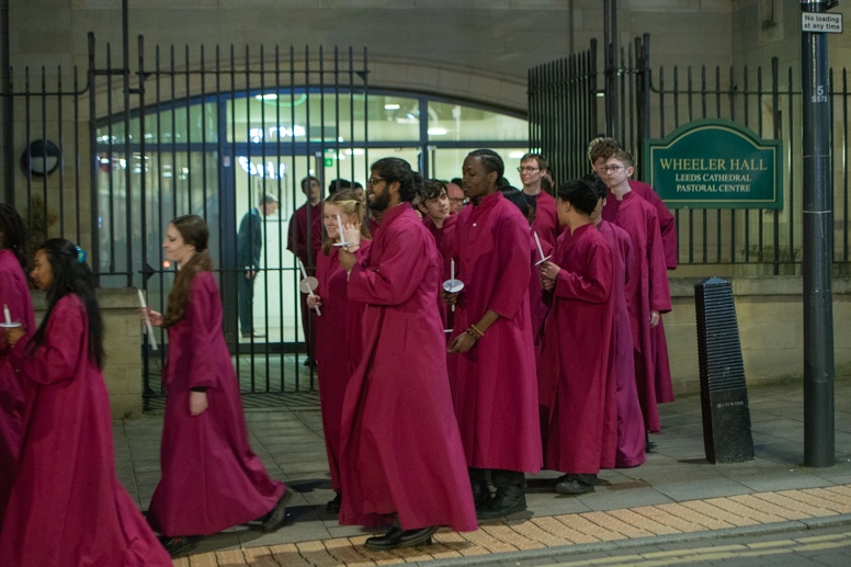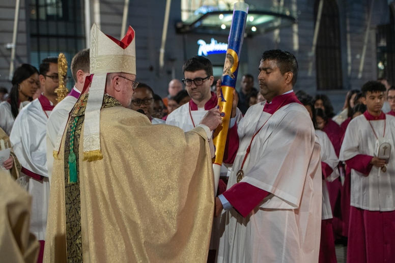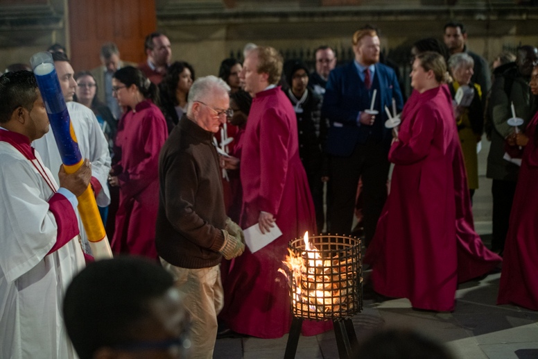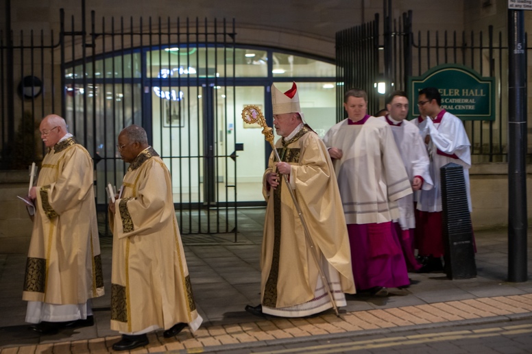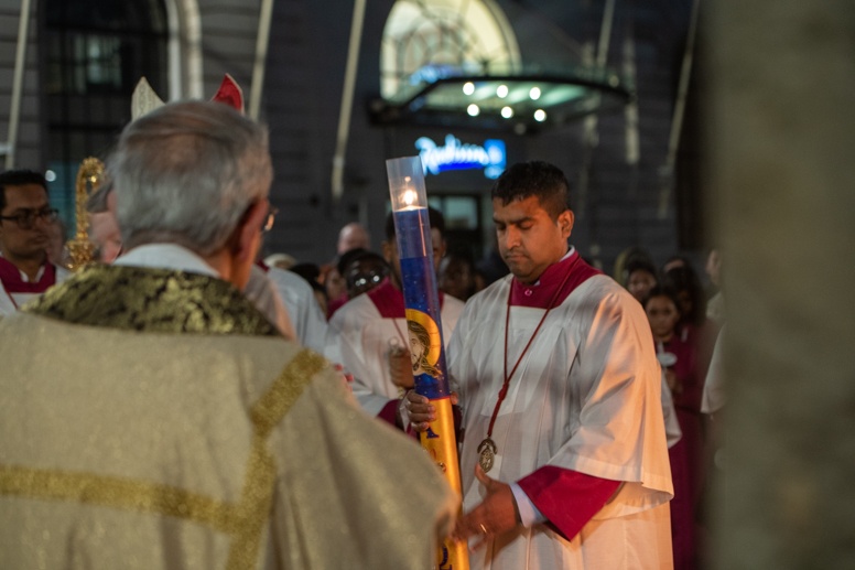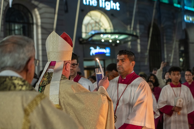 Easter Vigil began outside the Leeds Cathedral where Bishop Marcus blesses the Easter Light and ignites the paschal candle that will then light candles for the rest of the congregation.
