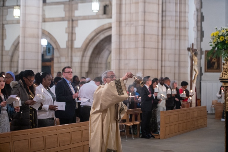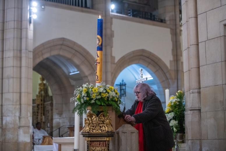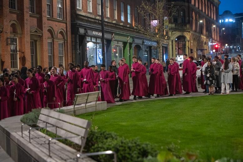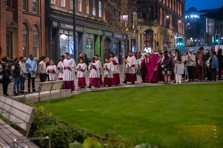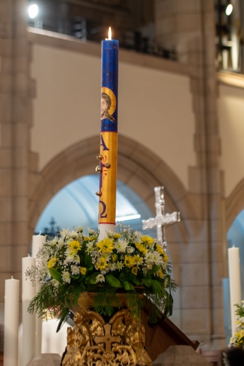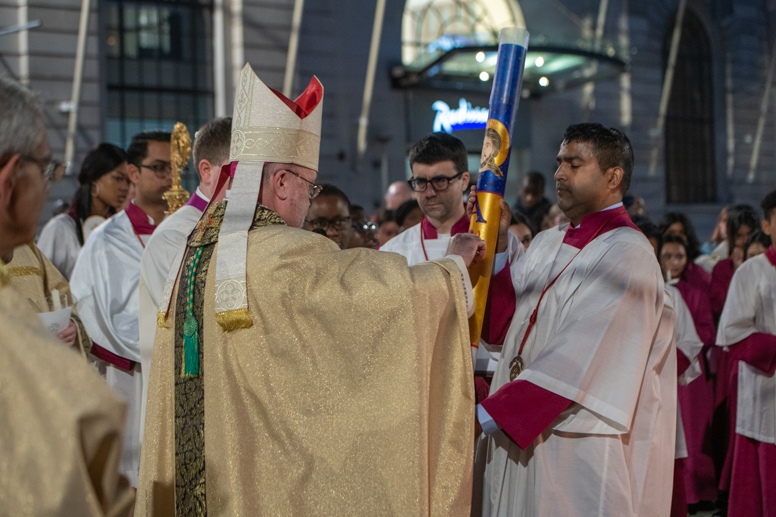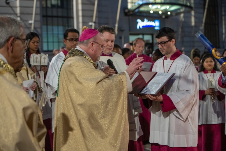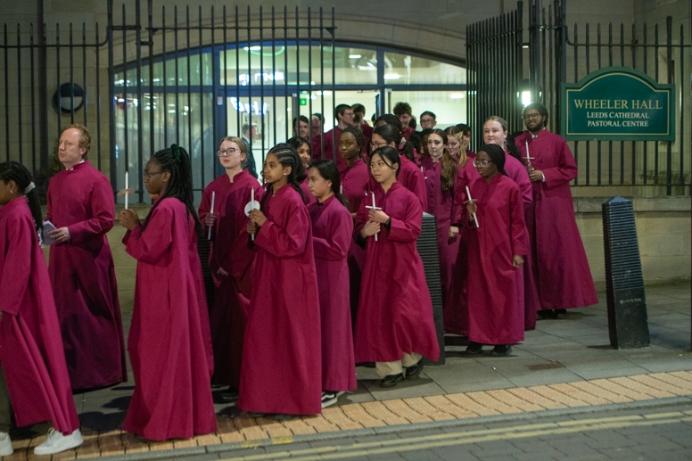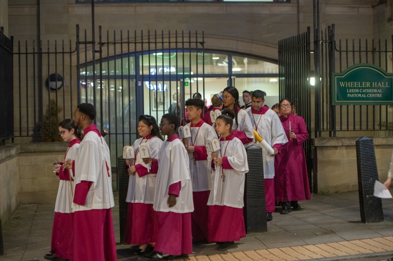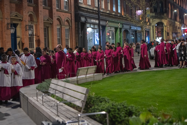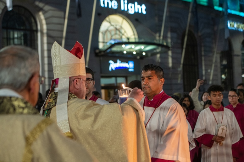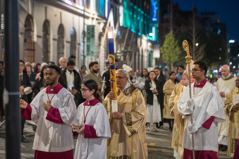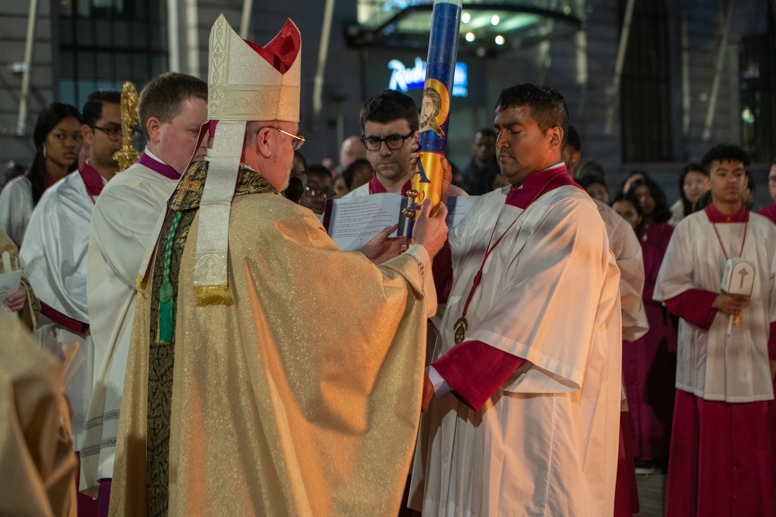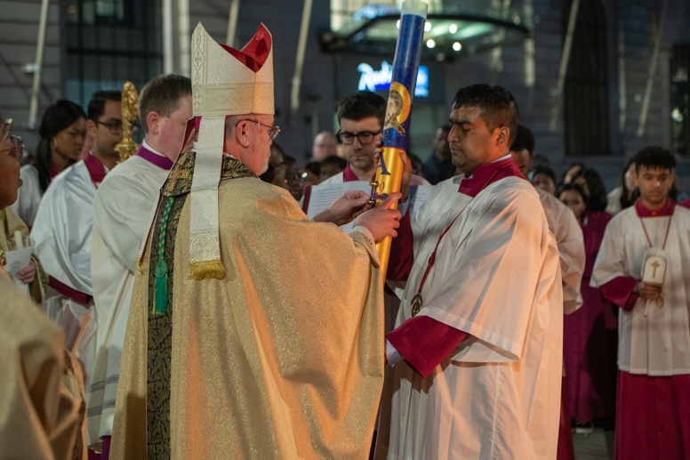 Easter Vigil began outside the Leeds Cathedral where Bishop Marcus blesses the Easter Light and ignites the paschal candle that will then light candles for the rest of the congregation.