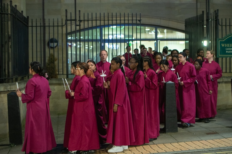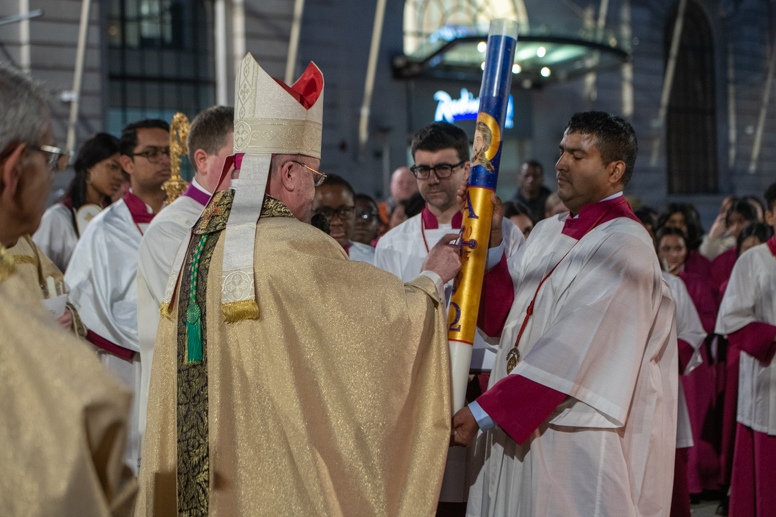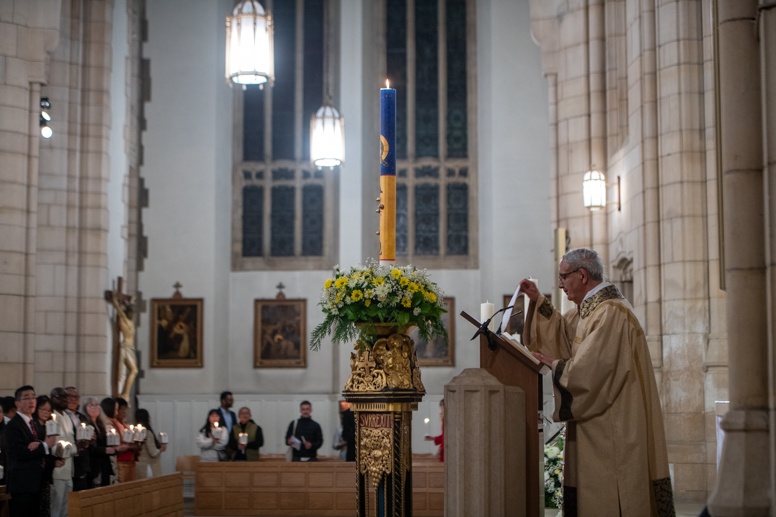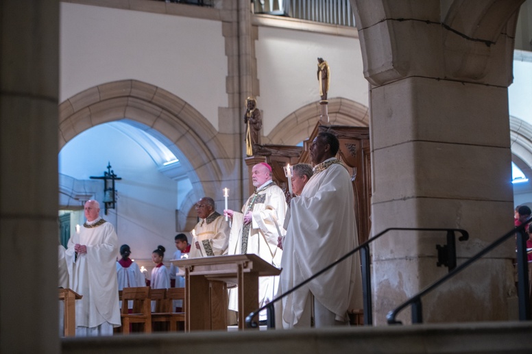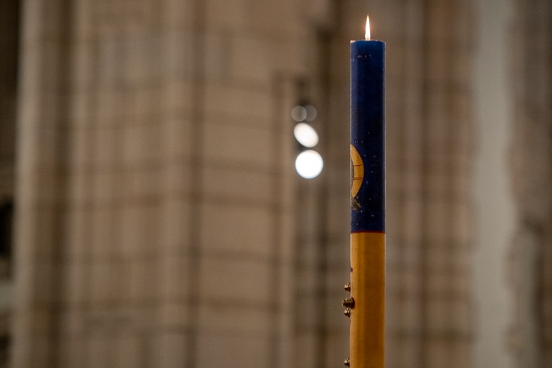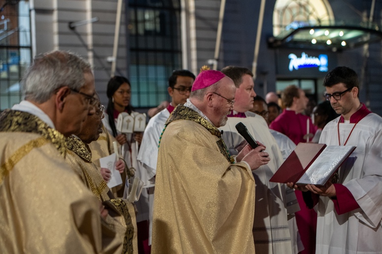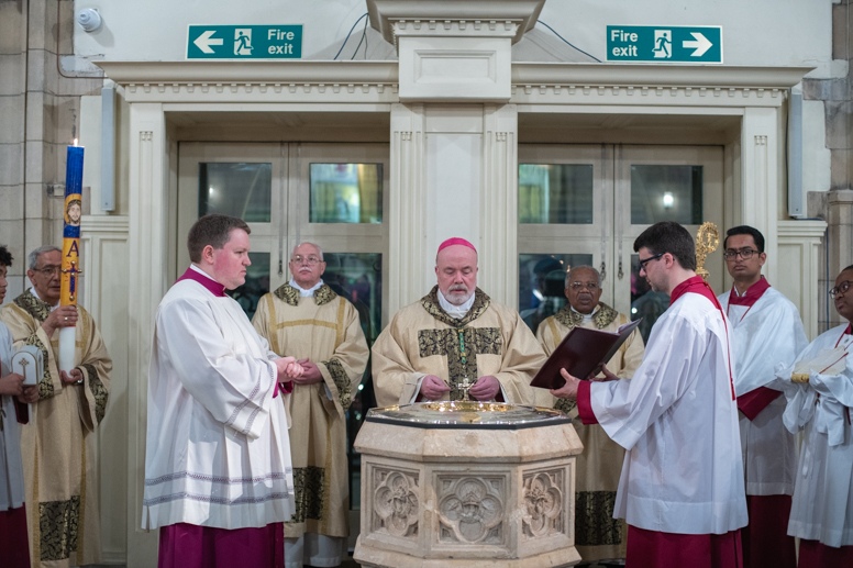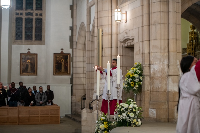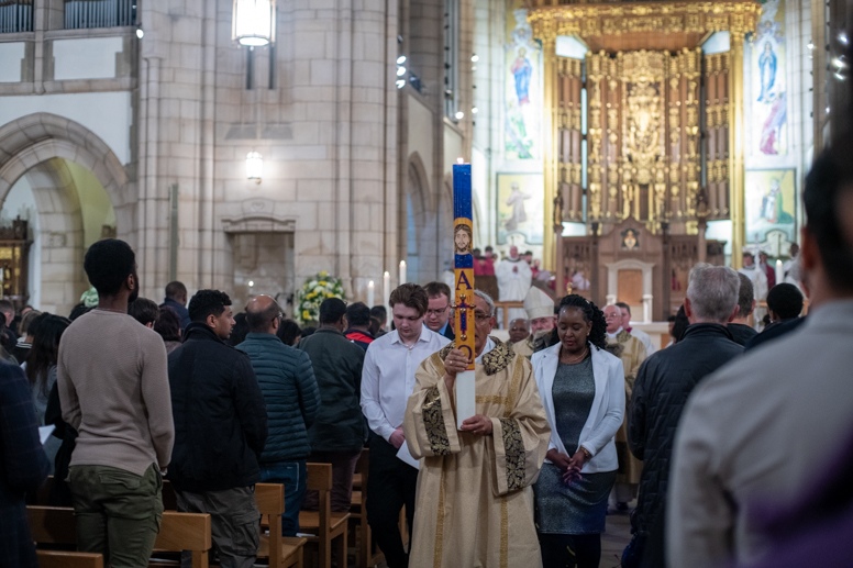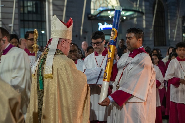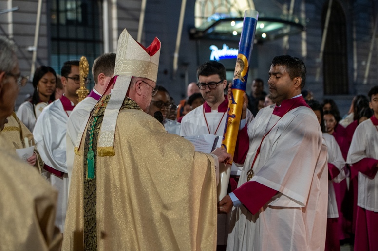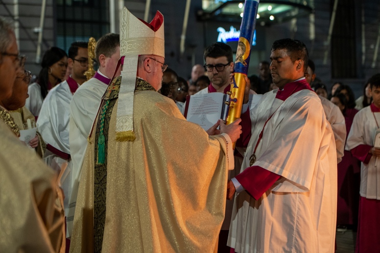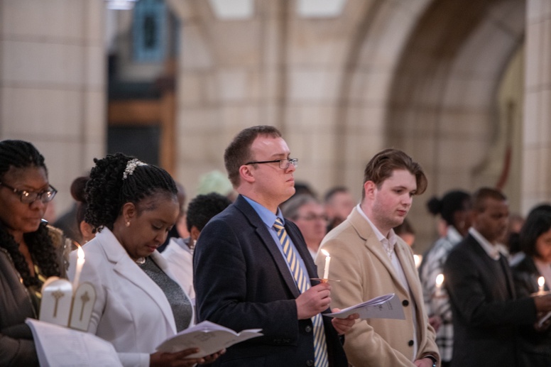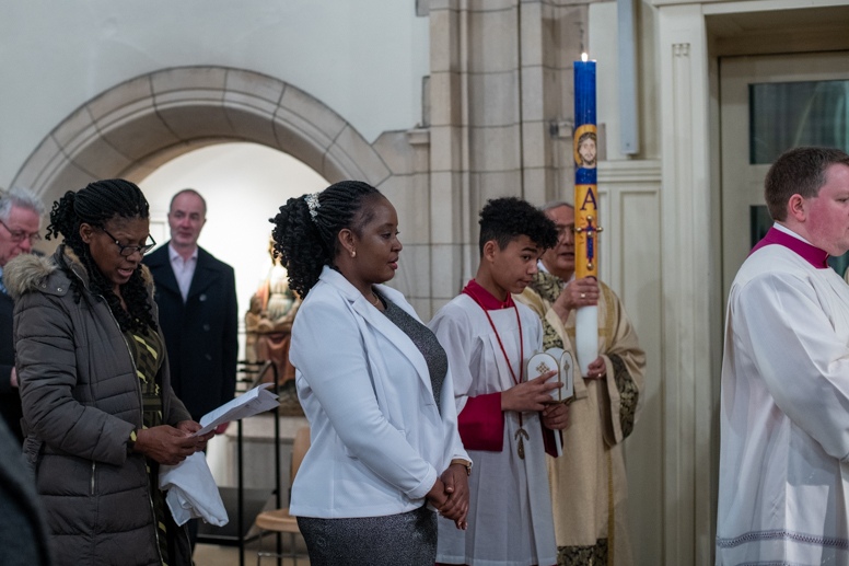 Easter Vigil began outside the Leeds Cathedral where Bishop Marcus blesses the Easter Light and ignites the paschal candle that will then light candles for the rest of the congregation.