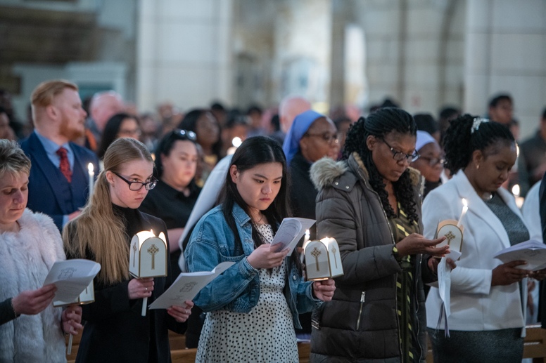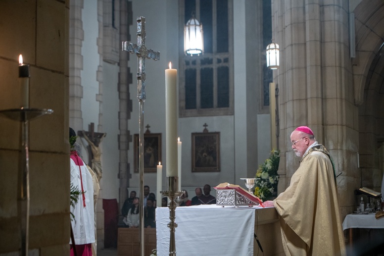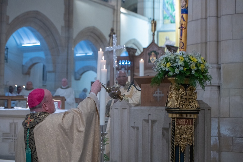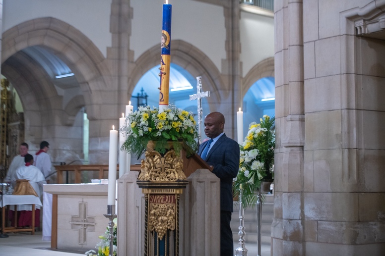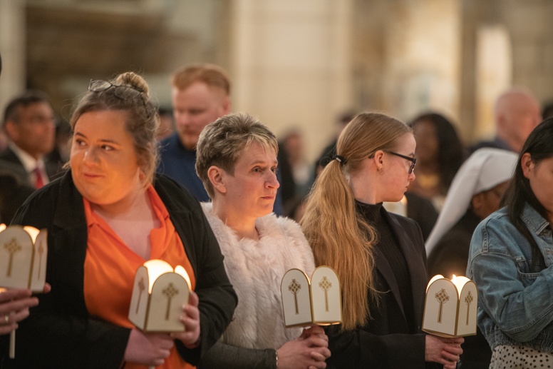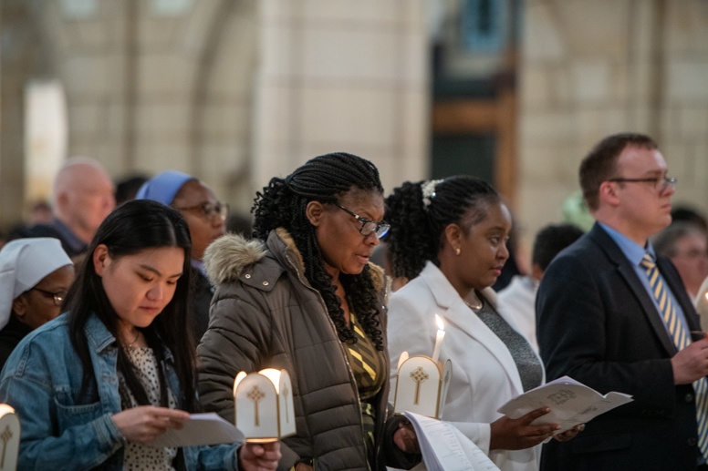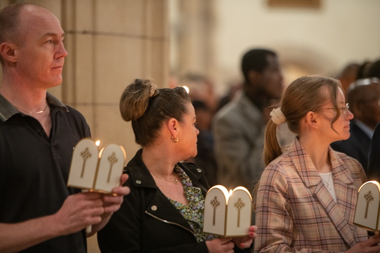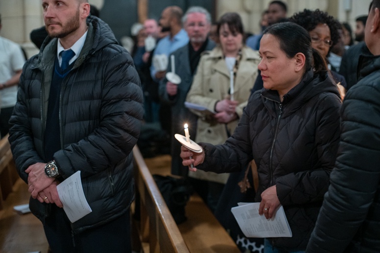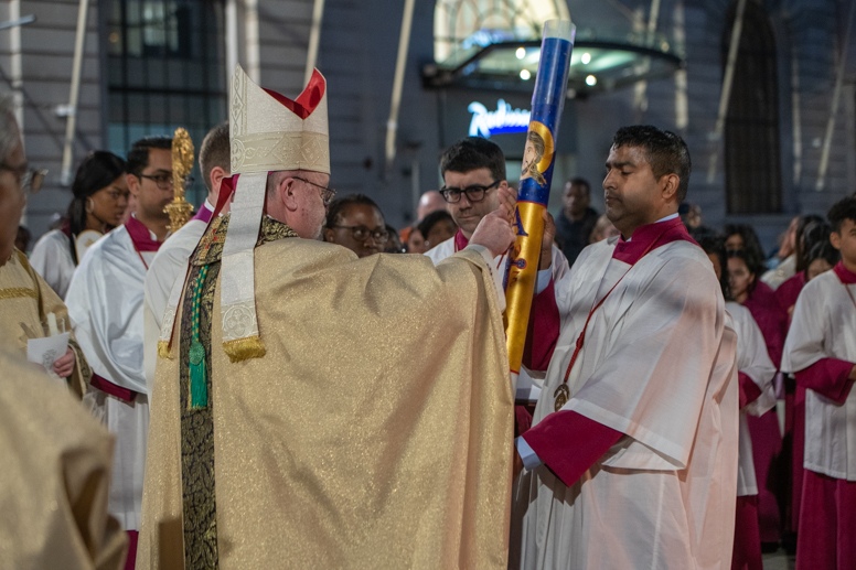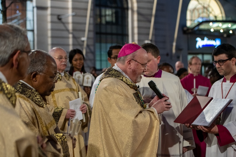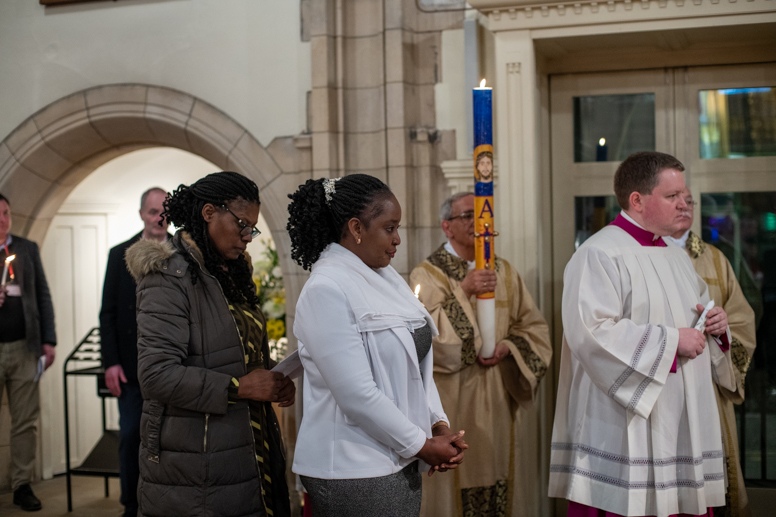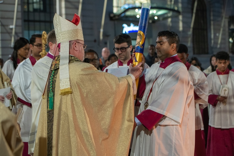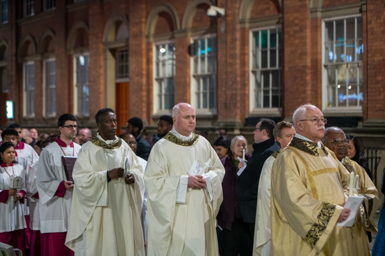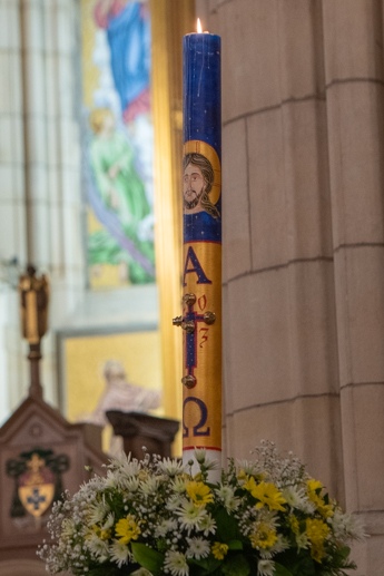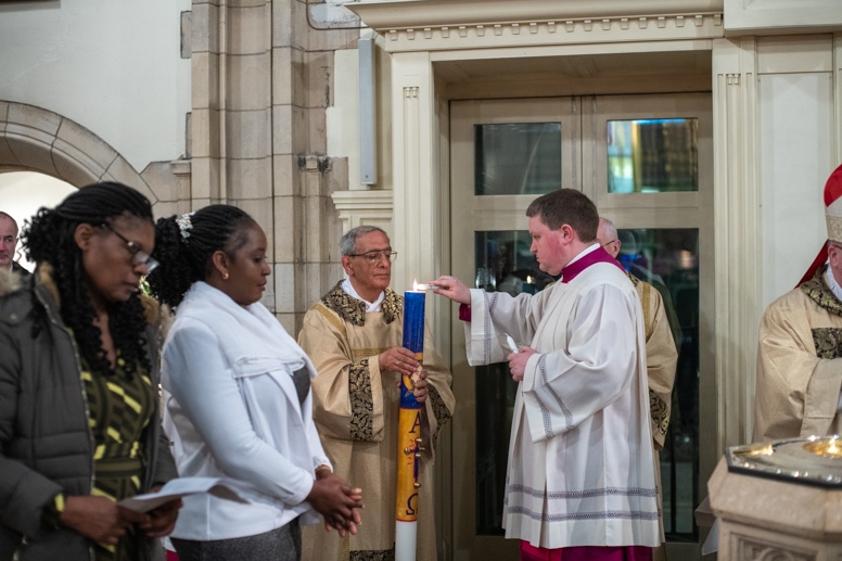Easter Vigil began outside the Leeds Cathedral where Bishop Marcus blesses the Easter Light and ignites the paschal candle that will then light candles for the rest of the congregation.