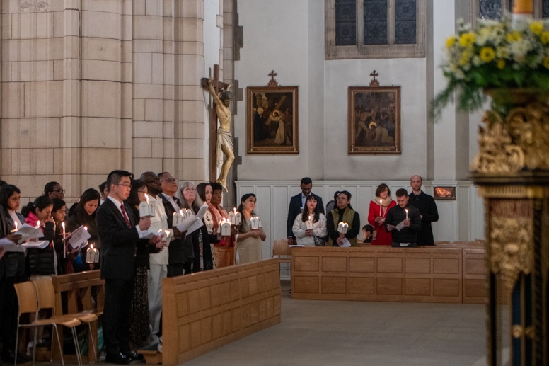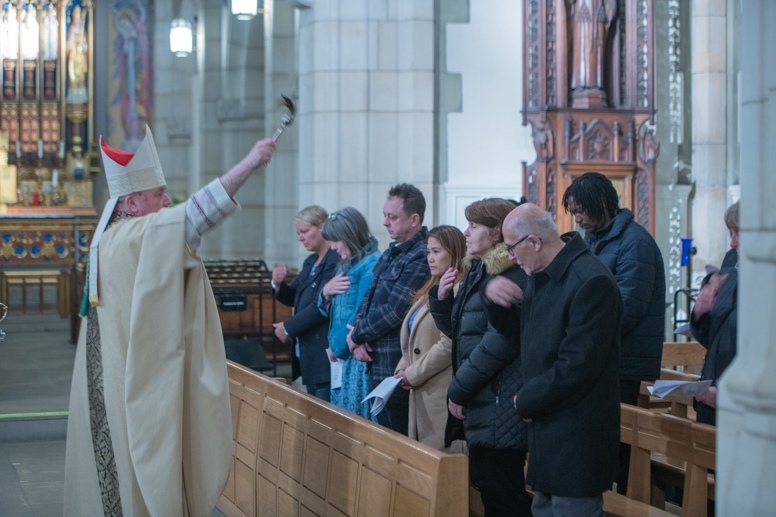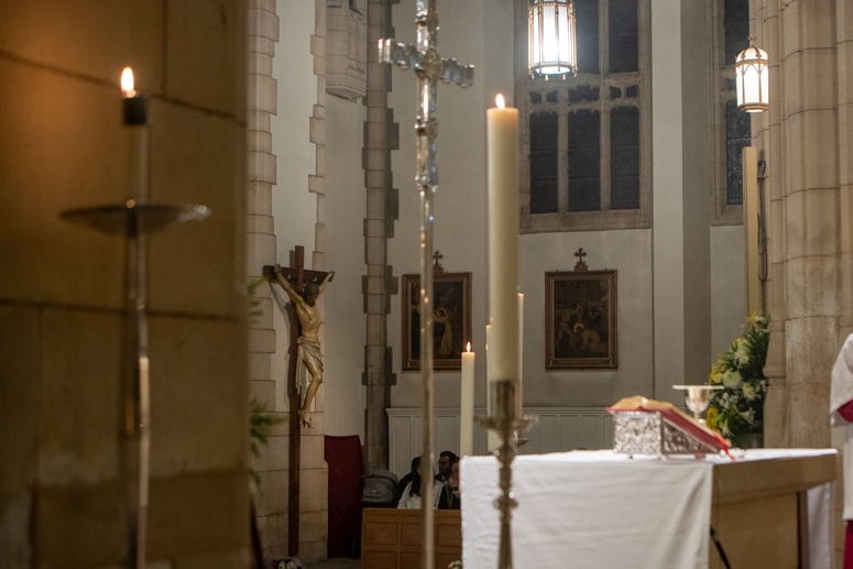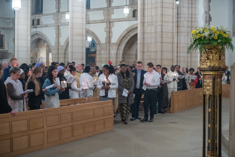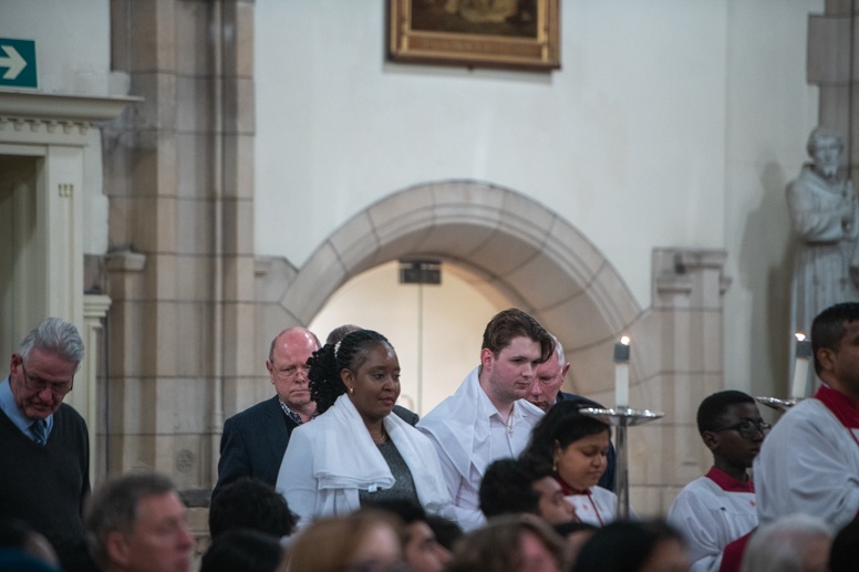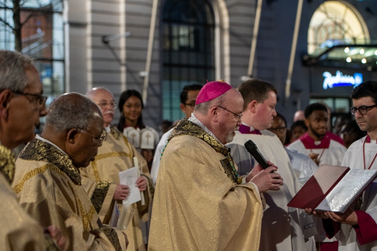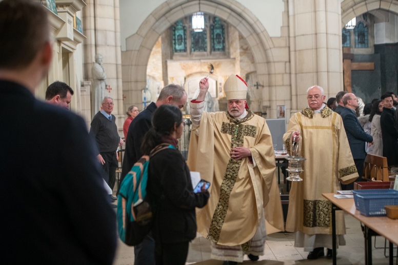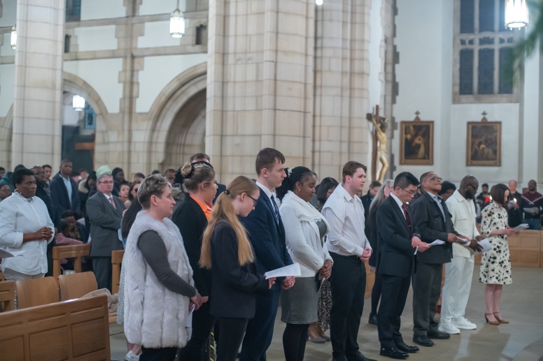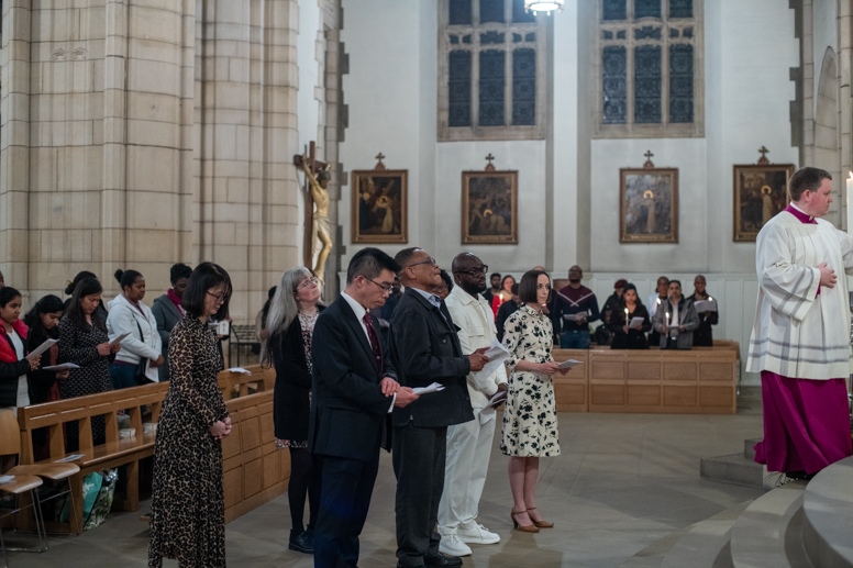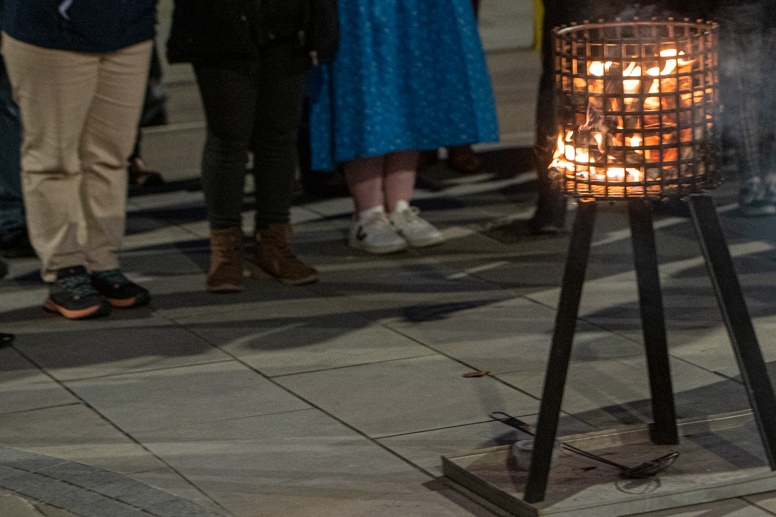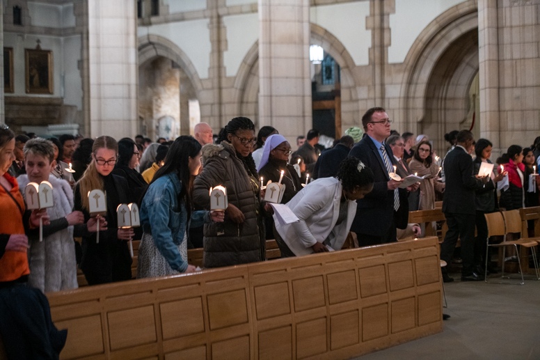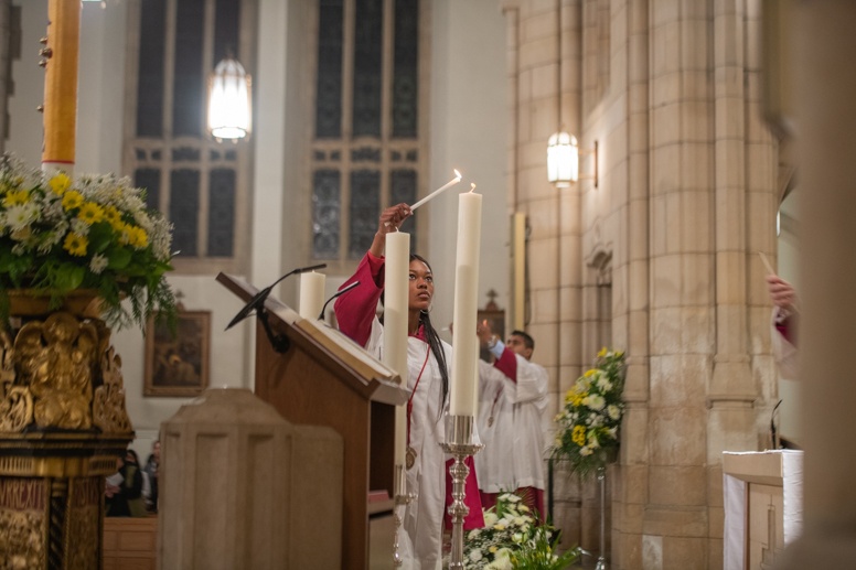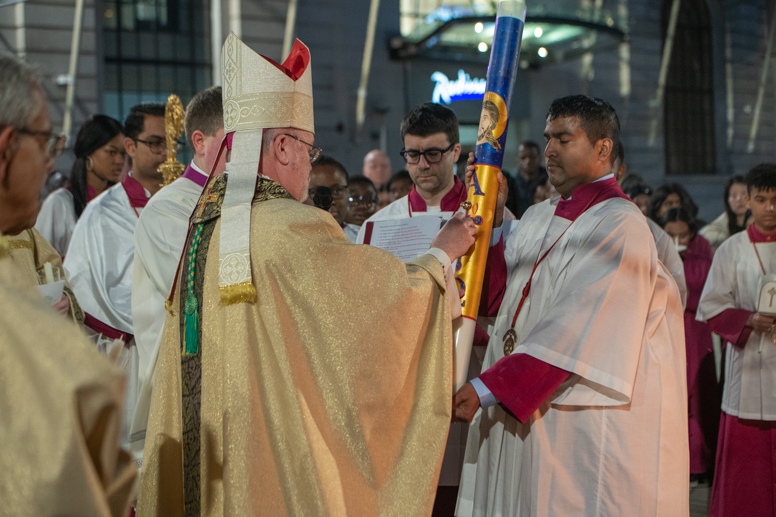 Easter Vigil began outside the Leeds Cathedral where Bishop Marcus blesses the Easter Light and ignites the paschal candle that will then light candles for the rest of the congregation.