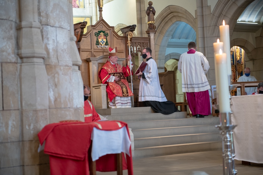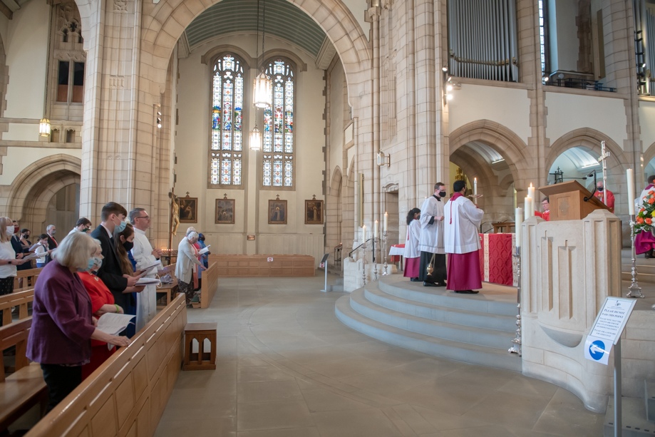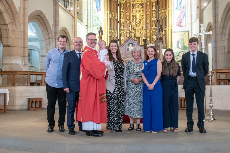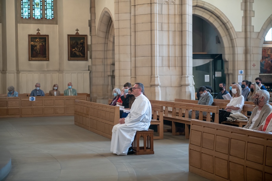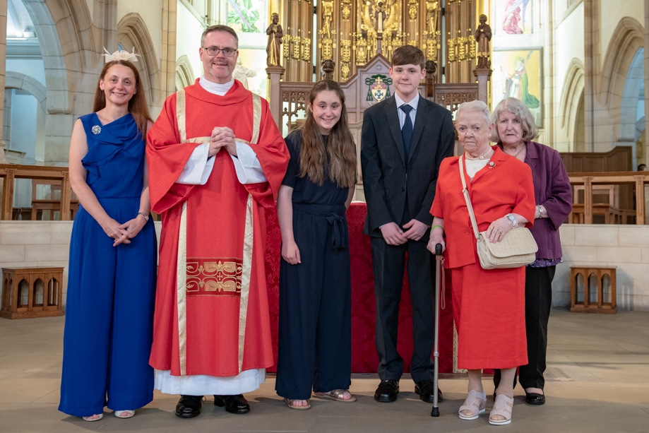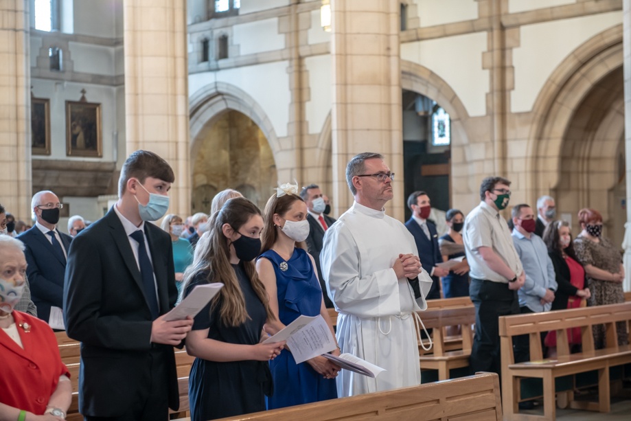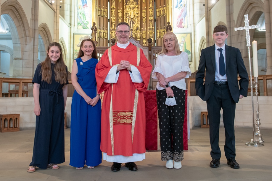 Bishop Marcus Stock concelebrated with Rev Monsignor Paul Fisher Vicar General, Canon Matthew Habron, Dean of the Cathedral, and Rev Fr Michael Walsh, Parish Priest of the Immaculate Heart, Huddersfield. Deacon James was presented for ordination by Rev David Arblaster, Director of the Permanent Diaconate. Also present was former Director, Rev Keith Ballard. The First Reading was read by Deacon James’ daughter, Beatrice and at the beginning of the Liturgy of the Eucharist, the Gifts were presented by his wife, Nicky, and their son, William.