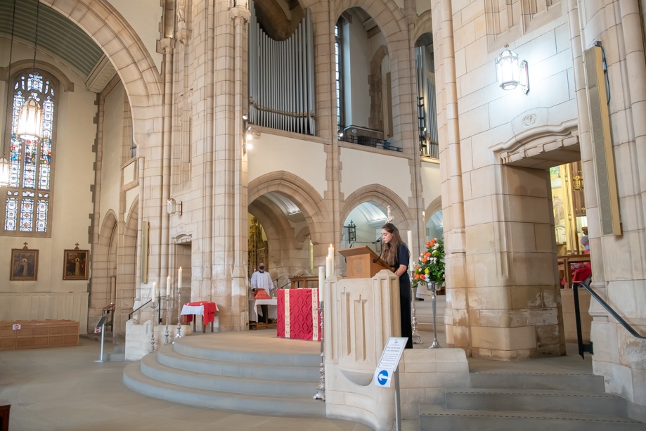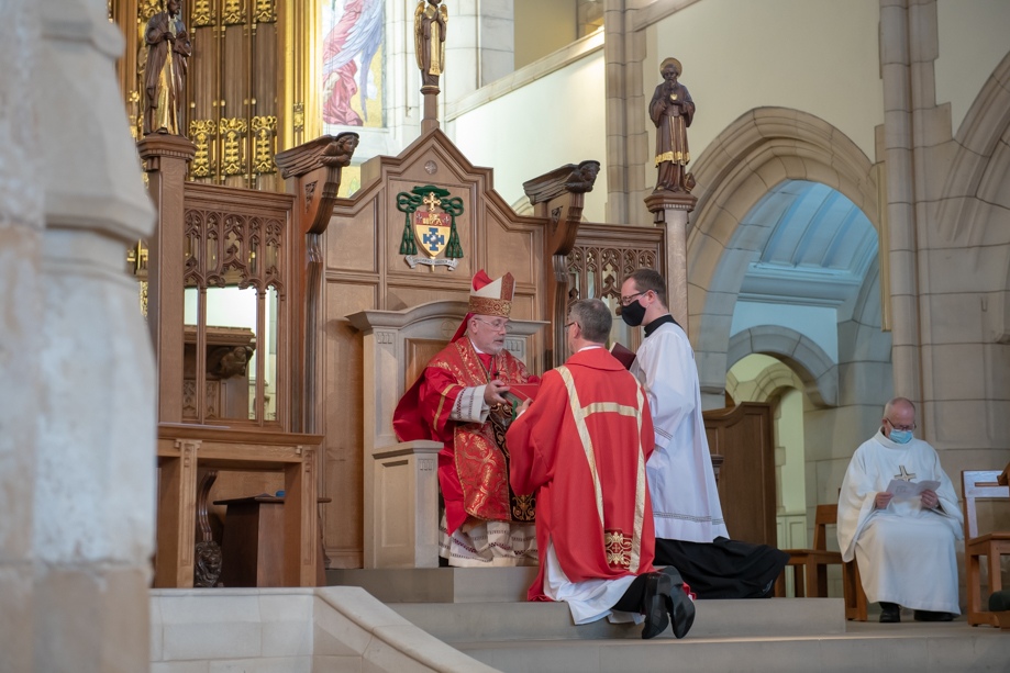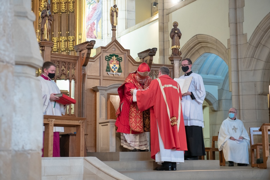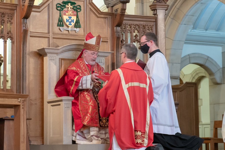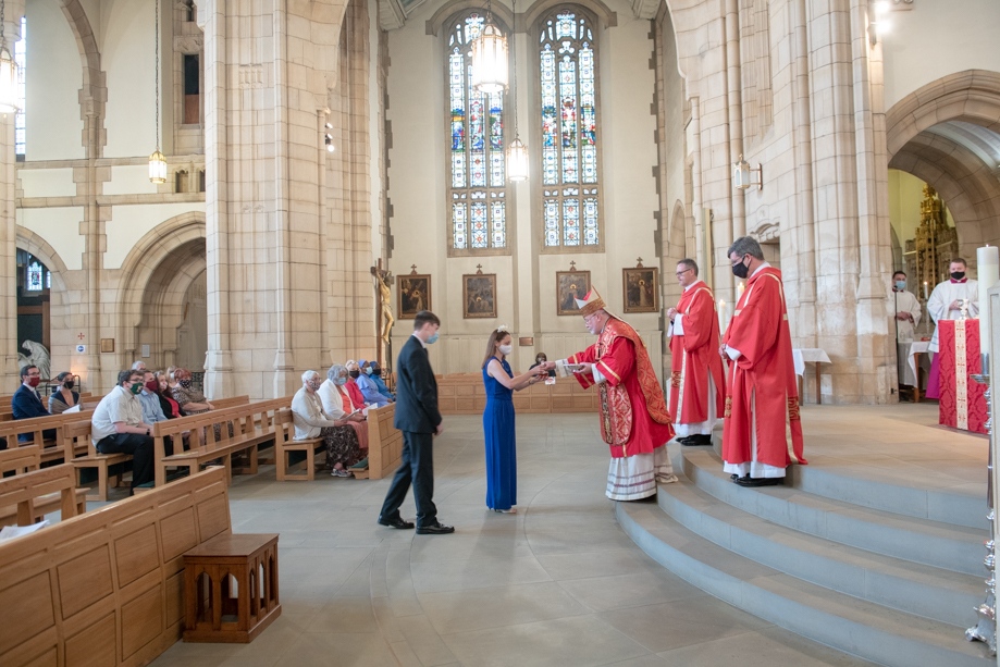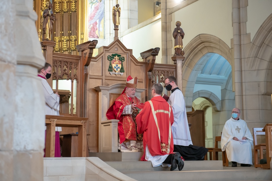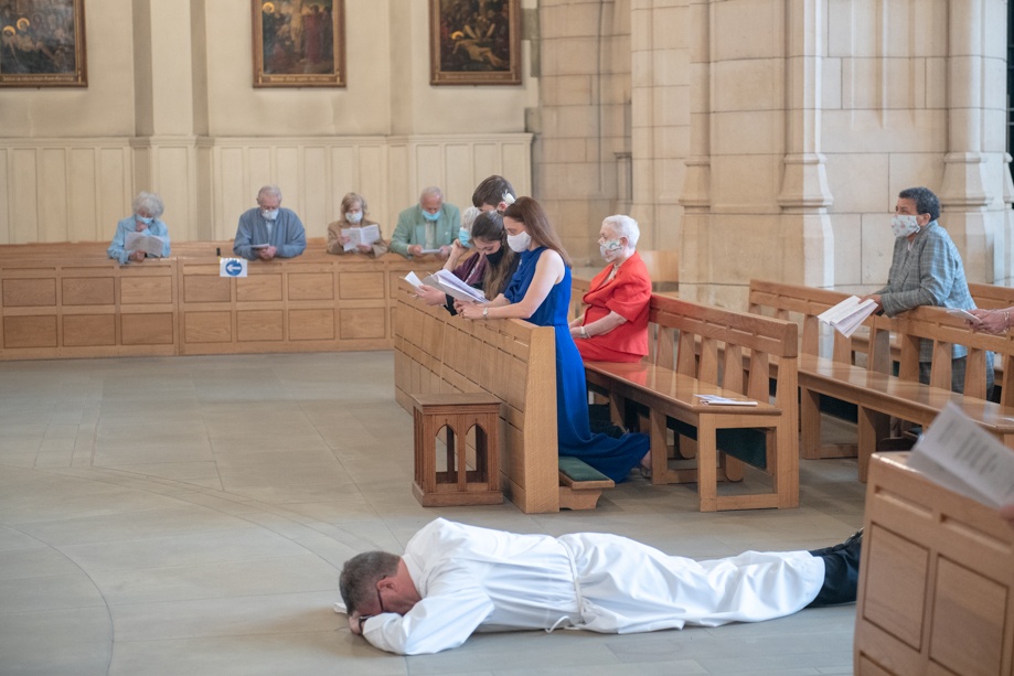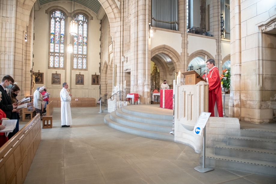 Bishop Marcus Stock concelebrated with Rev Monsignor Paul Fisher Vicar General, Canon Matthew Habron, Dean of the Cathedral, and Rev Fr Michael Walsh, Parish Priest of the Immaculate Heart, Huddersfield. Deacon James was presented for ordination by Rev David Arblaster, Director of the Permanent Diaconate. Also present was former Director, Rev Keith Ballard. The First Reading was read by Deacon James’ daughter, Beatrice and at the beginning of the Liturgy of the Eucharist, the Gifts were presented by his wife, Nicky, and their son, William.
